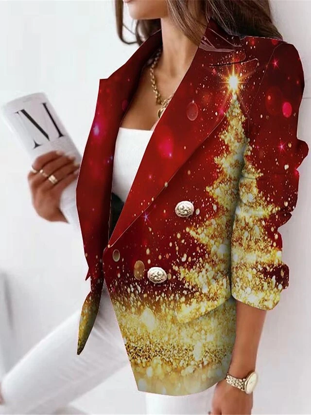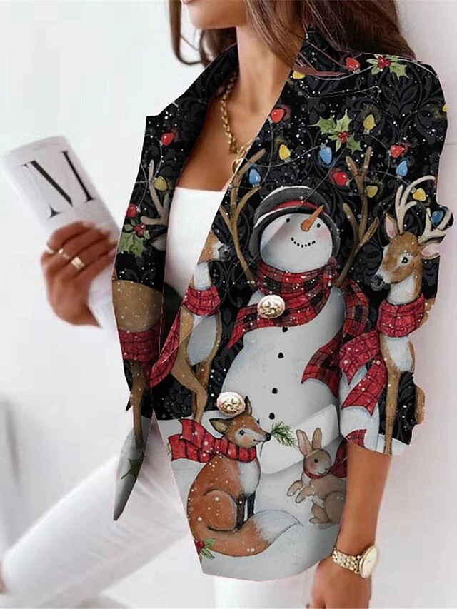 Women’s Blazer Breathable Office Christmas Work Wear To Work With Pockets Print Double Breasted Turndown Modern Formal Office / Career Xmas Snowman Regular Fit Outerwear Long Sleeve Fall Winter