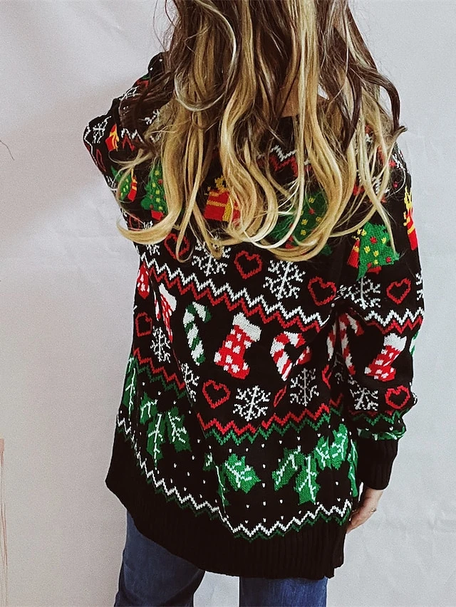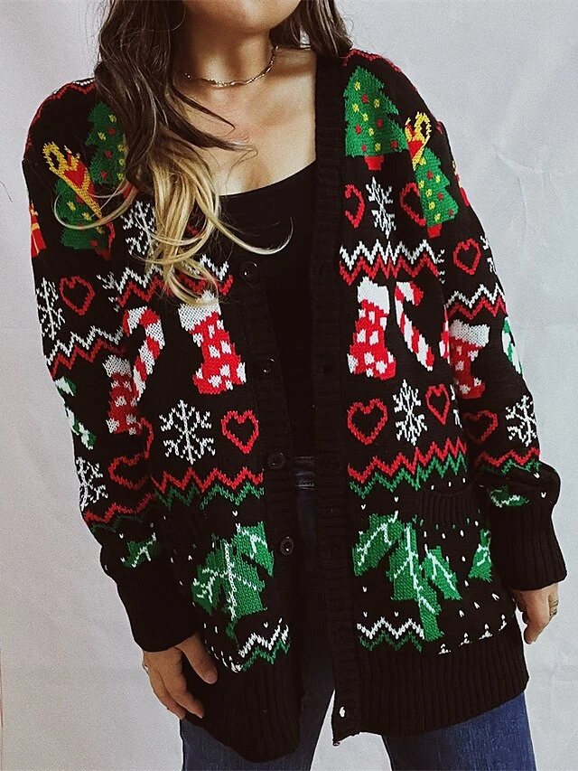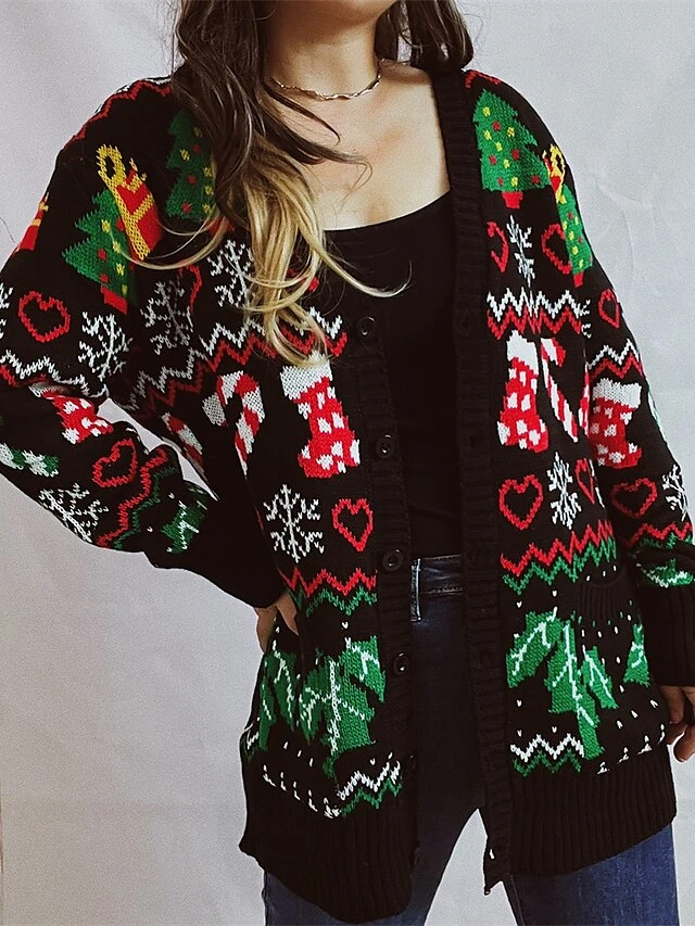 Women’s Cardigan Christmas Sweaters V Neck Chunky Knit Polyester Button Knitted Spring Fall Winter Long Christmas Daily New Year Fashion Daily Vintage Style Long Sleeve Christmas Tree Snowflake Black