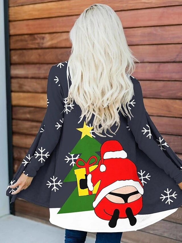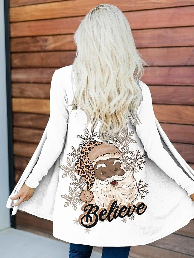 Women’s Christmas Casual Jacket Xmas Santa Claus Print Red Open Front Cardigan Fashion Loose Fit Outerwear Long Sleeve White S