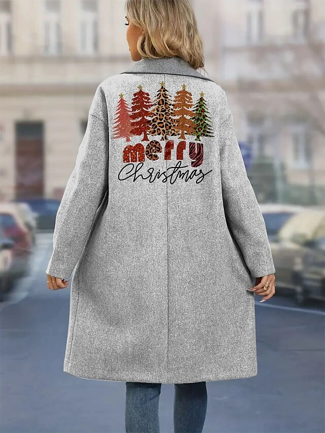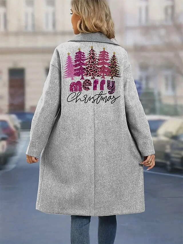 Women’s Christmas Coat Xmas Tree Print Double Breasted Lapel Pea Coat Fall Party Wear Warm Windproof Trench Coat