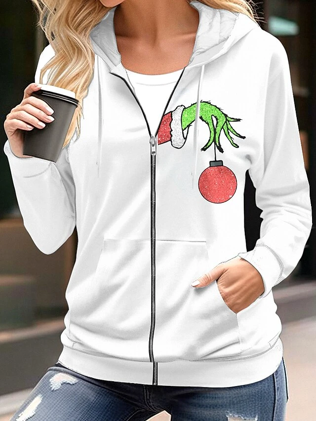 Women’s Christmas Grinch Hoodie Jacket Fall Zip Up Sport Coat Drawstring Jacket Casual / Daily Xmas Fashion Loose Fit Outerwear Long Sleeve Fall Dark Green S