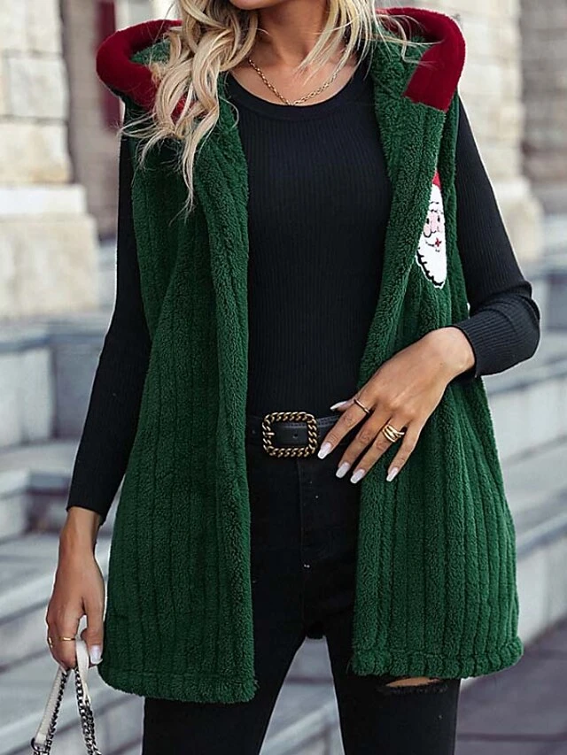 Women’s Christmas Jacket Santa Sherpa Vest Sleeveless Sherpa Jacket Fleece Teddy Coat Hooded Jacket Claus Thermal Lightweight Streetwear Xmas Outerwear Long Sleeve Green S