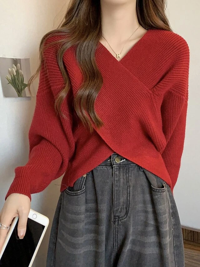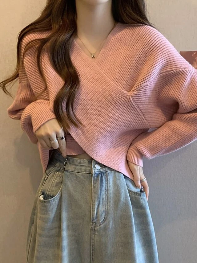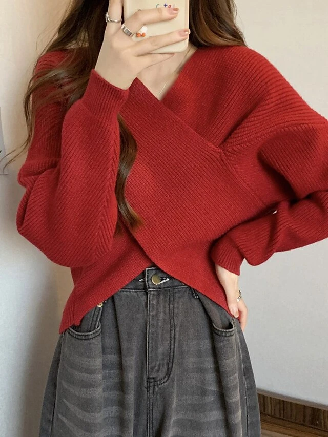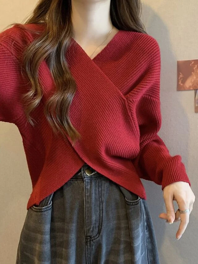 Women’s CroppedSweater Pullover Sweater Jumper V Neck Ribbed Knit Polyester Knitted Fall Winter Short Outdoor Christmas Daily Stylish Casual Soft Long Sleeve Solid Color Black Pink Red S M L