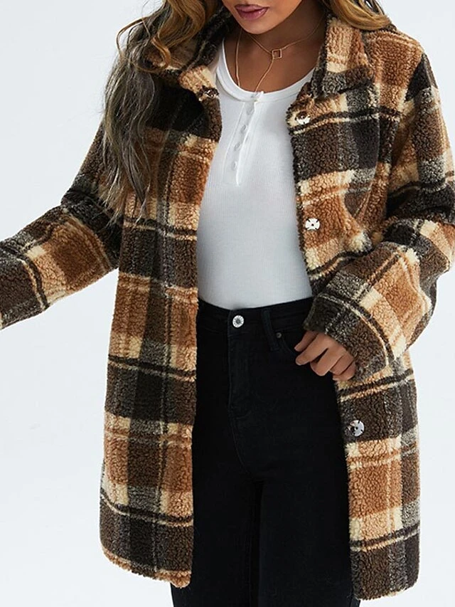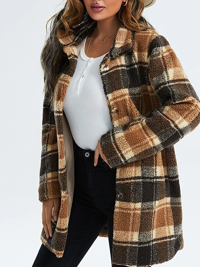 Women’s Fleece Jacket Sherpa Jacket Coat Warm Breathable Outdoor Christmas Daily Vacation Xmas Pocket Single Breasted Turndown Plush Comfortable Street Style Shacket Plaid Regular Fit Outerwear Long
