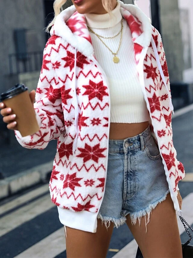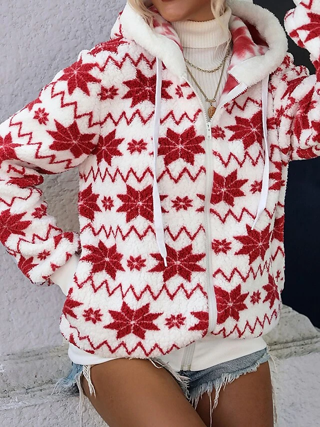 Women’s Fleece Jacket Sherpa Jacket Teddy Coat Windproof Warm Christmas Street Daily Wear Vacation Zipper Pocket Print Zipper Hoodie Fashion Plush Modern Casual Snowflake Regular Fit Outerwear Long