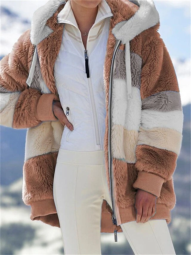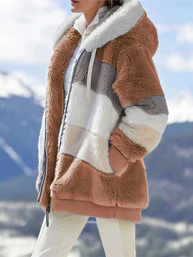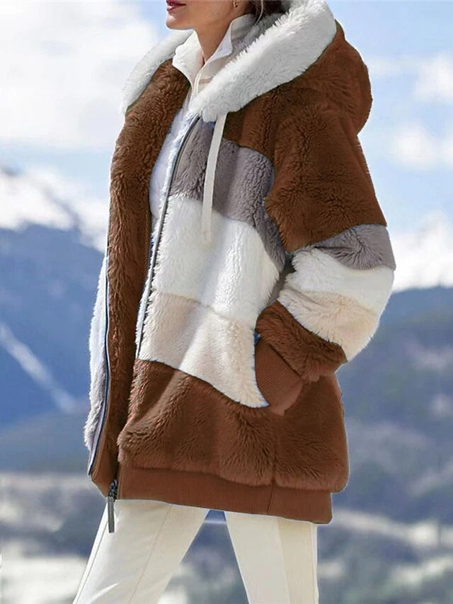 Women’s Fleece Jacket Teddy Coat Windproof Warm Holiday Daily Wear Weekend Patchwork Zipper Pocket Drawstring Zipper Hoodie Vintage Daily Plush Christmas Stripes Regular Fit Outerwear Long Sleeve