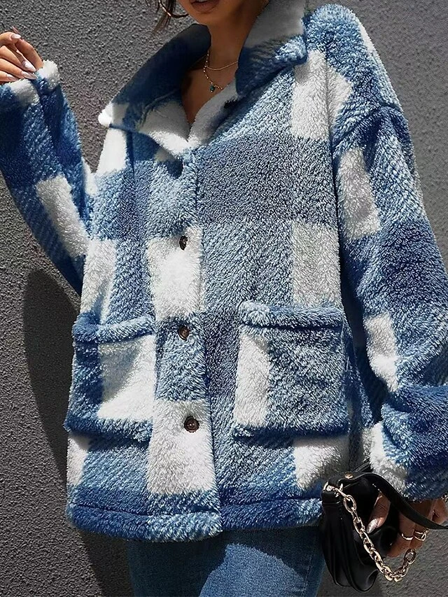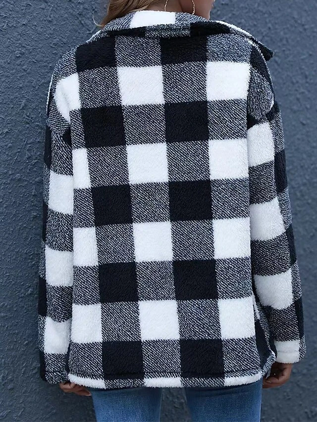 Women’s Fleece Sherpa Jacket Teddy Coat Christmas Plaid Winter Coat Windproof Warm Jacket With Pocket Single Breasted Outerwear Long Sleeve
