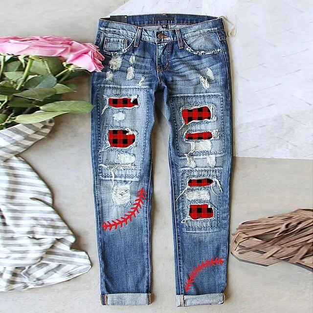 Women’s Jeans Distressed Jeans Denim Blue Fashion Christmas Xmas Street Casual Baggy Ripped Micro-elastic Full Length Comfort Plaid S M L XL XXL / Print