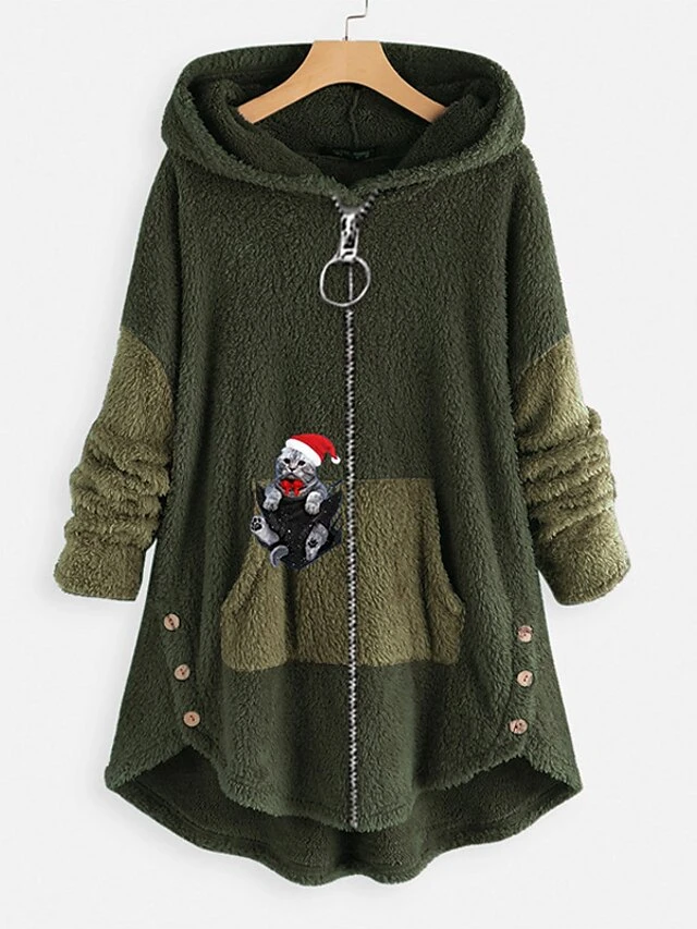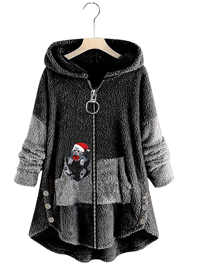 Women‘s Plus Size Christmas Fleece Jacket Teddy Coat Warm Button Pocket Animal Cat Causal Long Sleeve Hooded Regular Winter Fall Xmas Green Pink Dark Gray L XL XXL 3XL 4XL