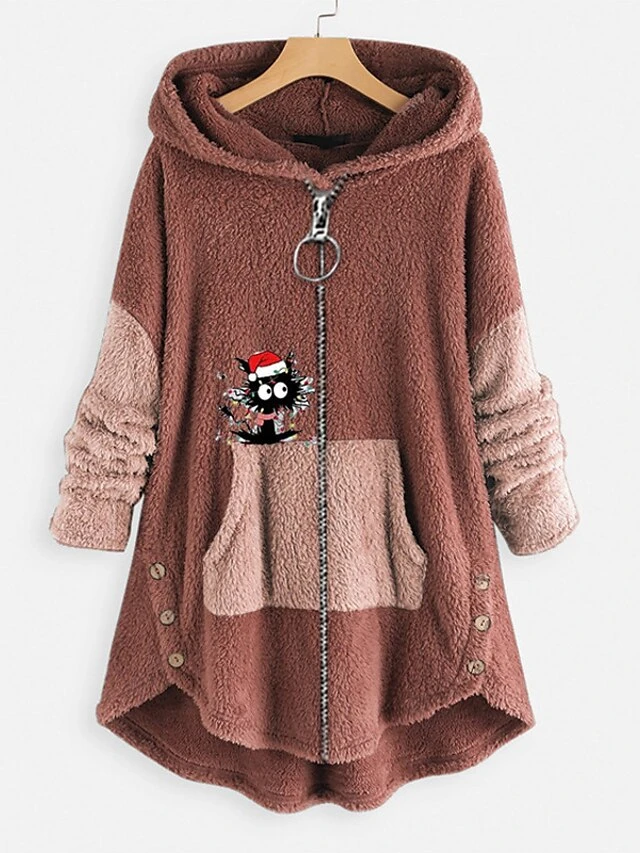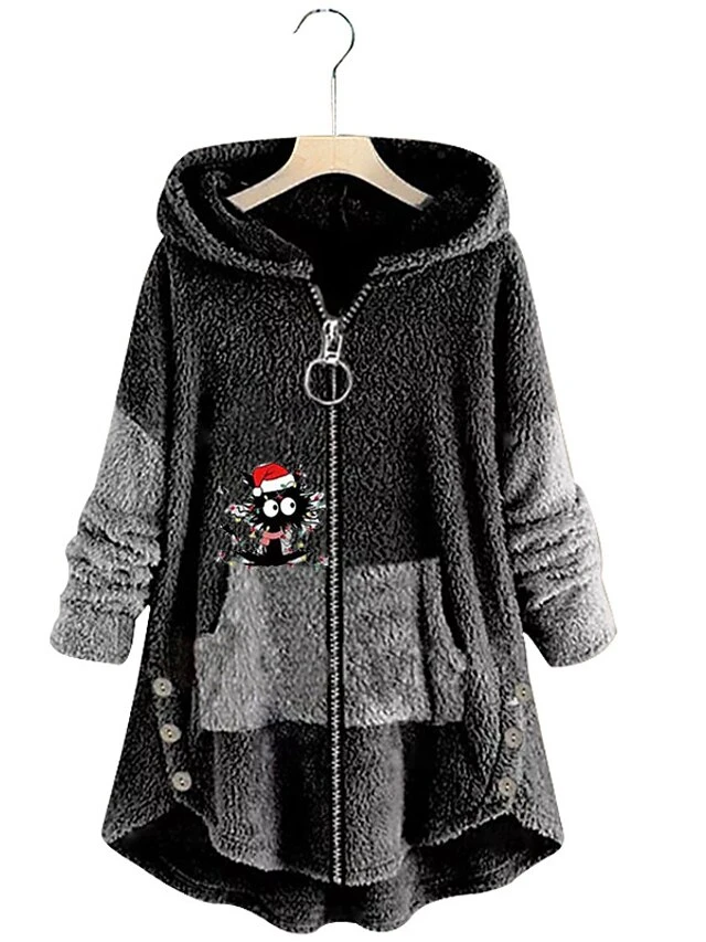 Women‘s Plus Size Christmas Fleece Jacket Teddy Coat Warm Button Pocket Animal Cat Causal Long Sleeve Hooded Regular Xmas Winter Fall Green Pink Dark Gray L XL XXL 3XL 4XL