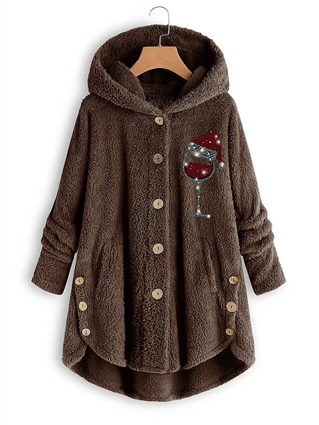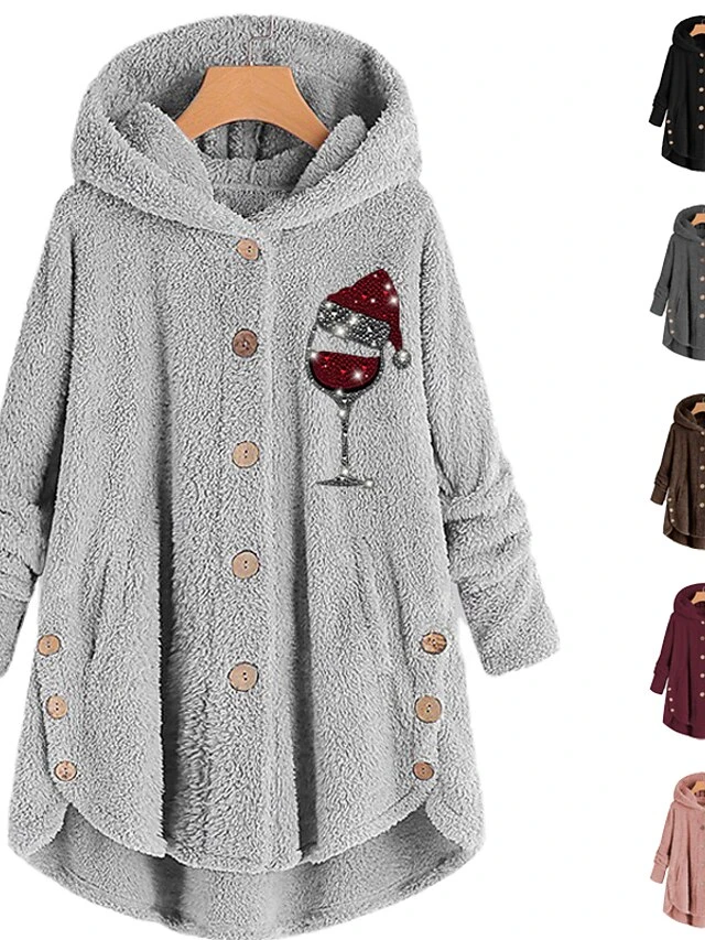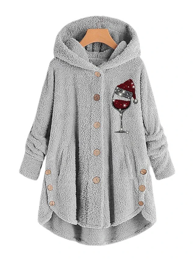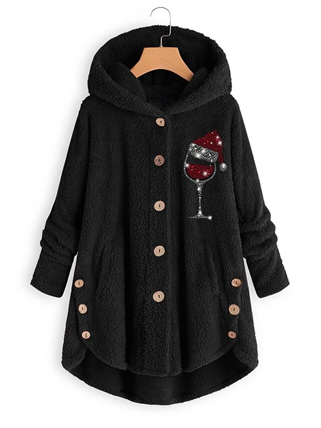 Women‘s Plus Size Christmas Fleece Jacket Teddy Coat Warm Button Pocket Graphic Hat Outdoor Xmas Long Sleeve Hooded Regular Winter Fall Black Pink Wine L XL XXL 3XL 4XL