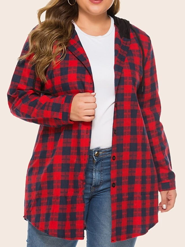 Women’s Plus Size Christmas Winter Jacket Jacket Button Plaid Long Sleeve Regular Winter Fall Green Black Red XL XXL 3XL 4XL 5XL / Daily
