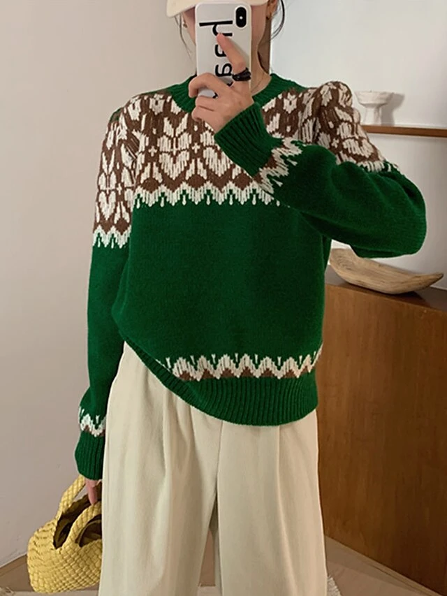 Women’s Pullover Sweater Jumper Crew Neck Ribbed Knit Polyester Knitted Print Fall Winter Regular Outdoor Christmas Daily Stylish Casual Soft Long Sleeve Heart Red Blue Green One-Size