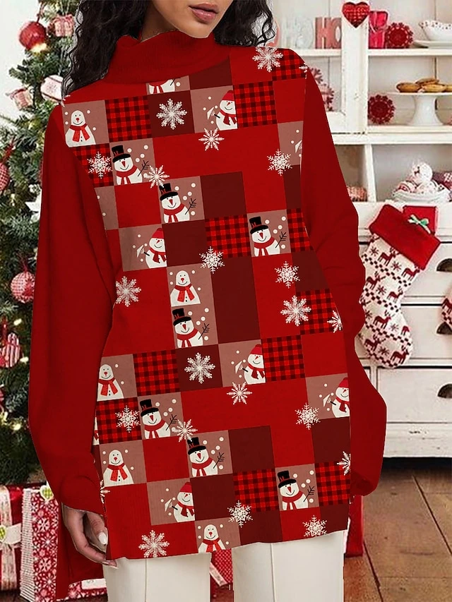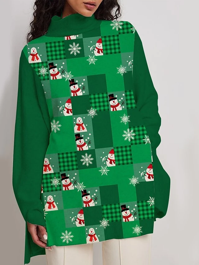 Women’s Pullover Sweater Jumper Turtleneck Crochet Knit Print Fall Winter Regular Christmas Weekend Stylish Vintage Style Long Sleeve Snowman Snowflake Light Green Wine S M L
