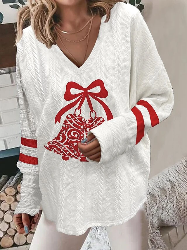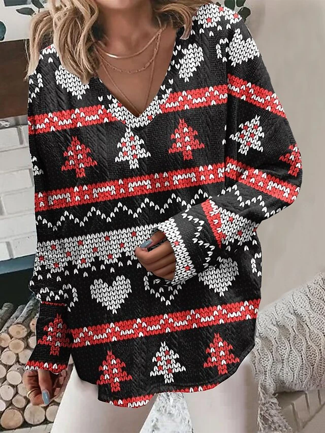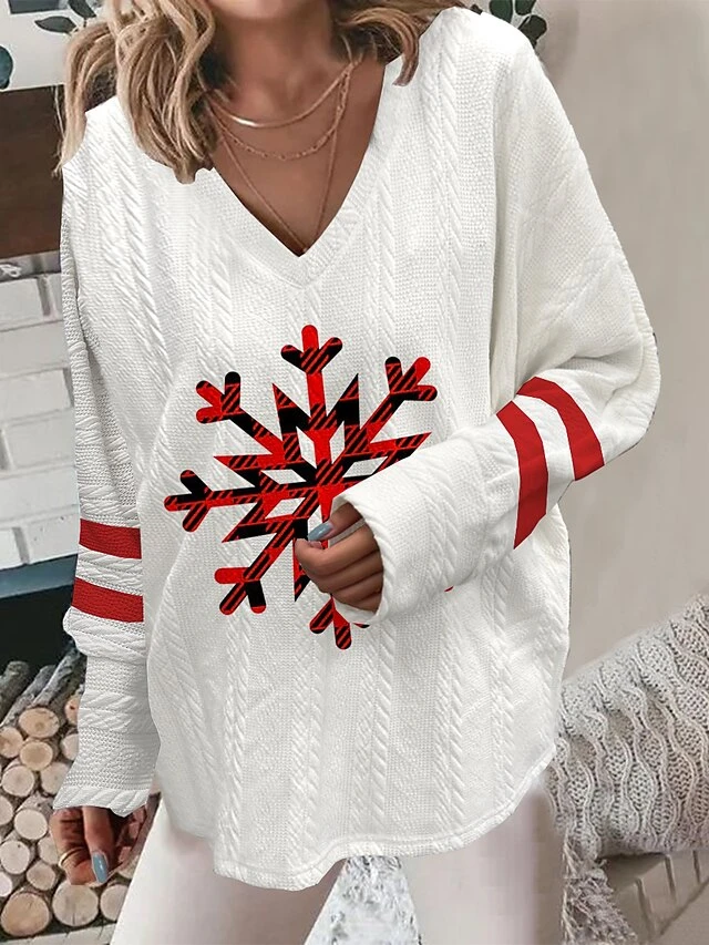 Women’s Pullover Sweater Jumper V Neck Crochet Knit Polyester Print Fall Winter Christmas Holiday Casual Soft Long Sleeve Snowman Xmas Tree Red Brown Black White S M L