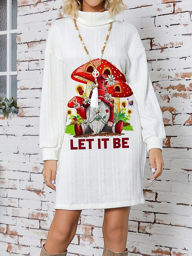 Women’s Sweater Dress Christmas Sweaters Stand Collar Ribbed Knit Polyester Knitted Print Fall Winter Long Christmas Holiday Going Out Daily Stylish Casual Long Sleeve Santa Claus White Red S M L