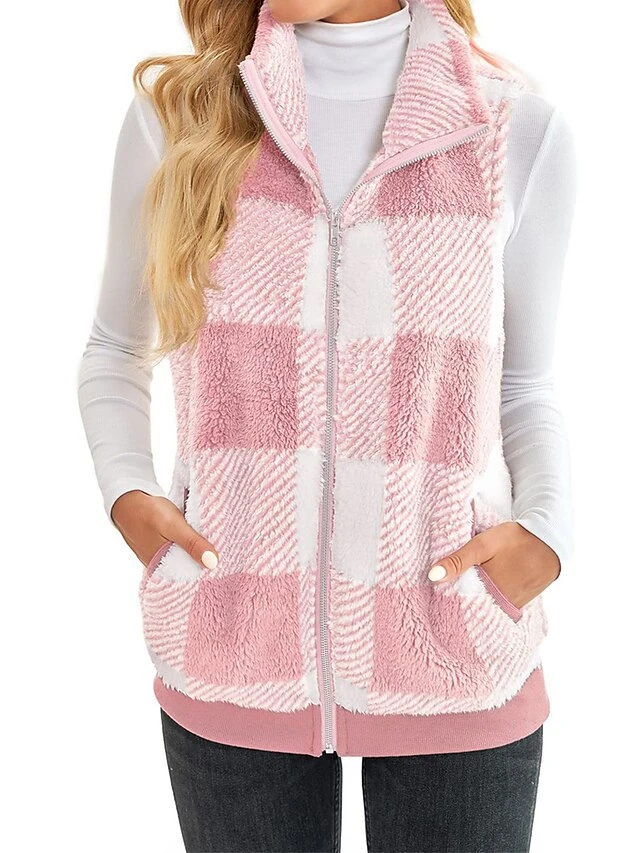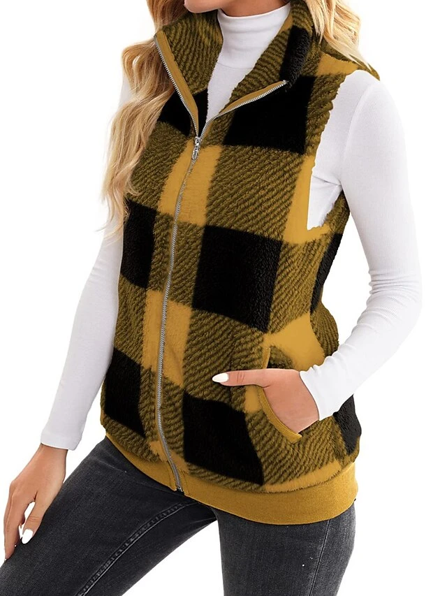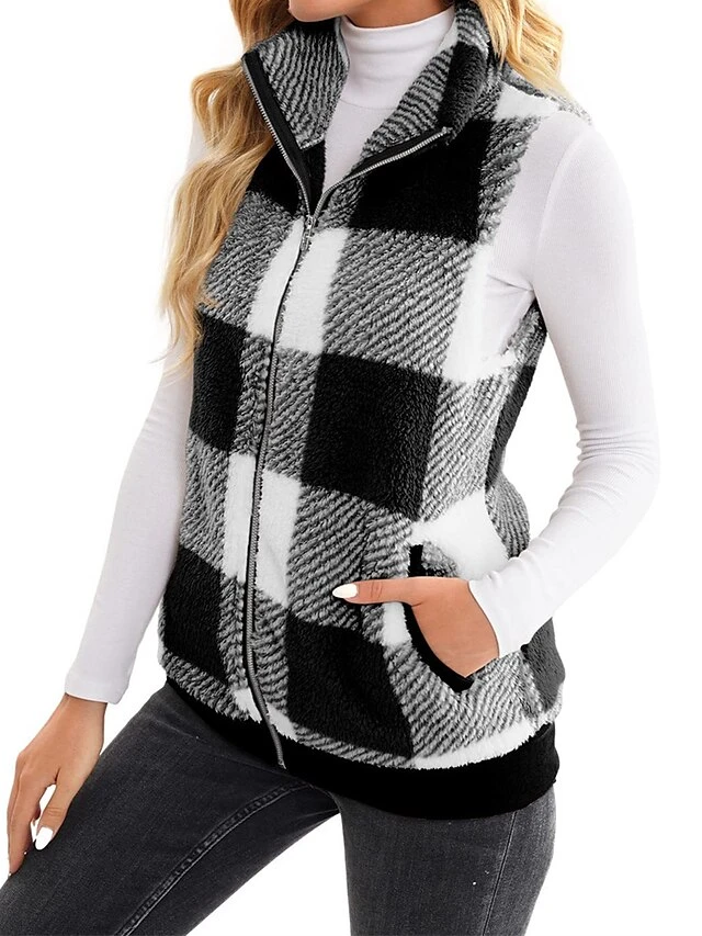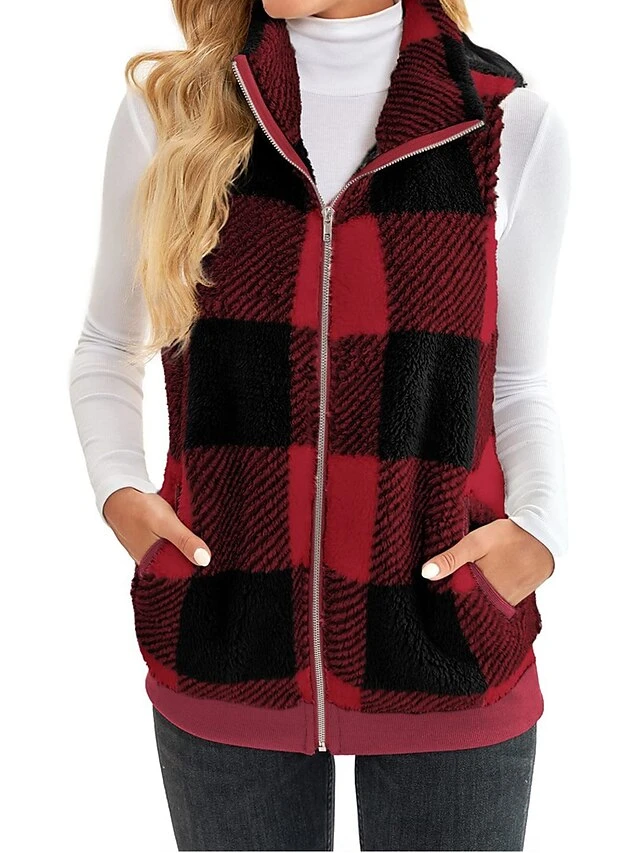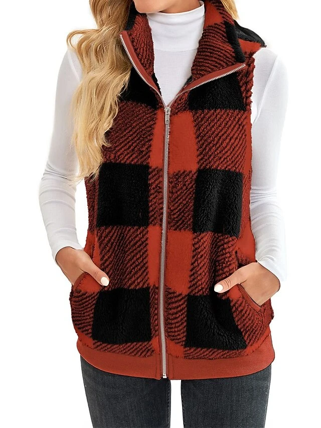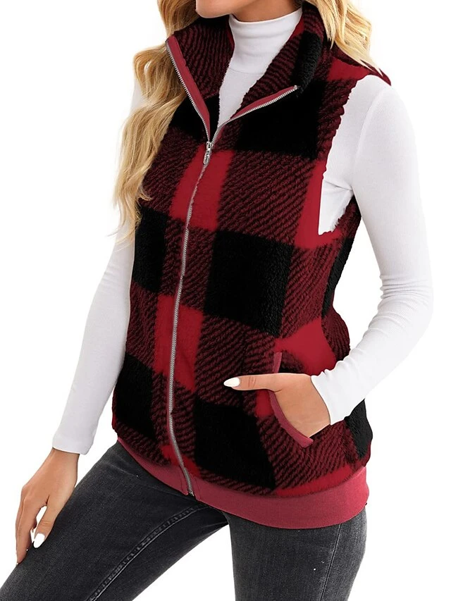 Women’s Teddy Vest Fleece Plaid Sleeveless Sherpa Coat Fall Winter Thermal Warm Christmas Outerwear With Pockets Stylish Contemporary Modern Style Jacket Sleeveless