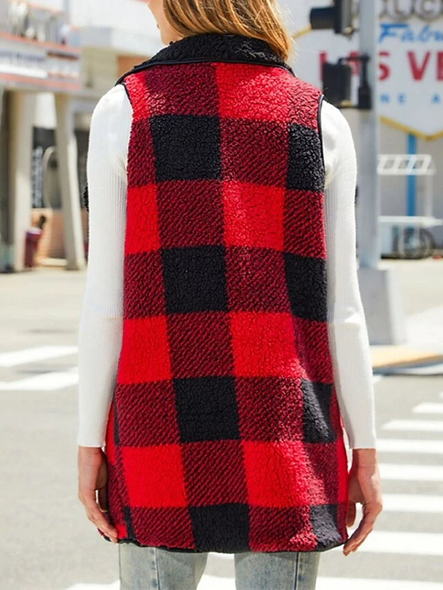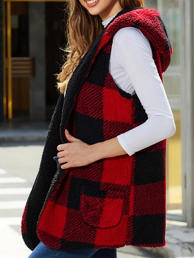 Women’s Teddy Vest Winter Christmas Plaid Sleeveless Teddy Coat With Hood Fall Open Front Sherpa Jacket With Pockets Thermal Warm Windproof Casual Daily Street Xmas Jacket Red