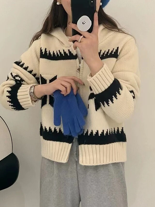 Women’s Ugly Christmas Sweater Cardigan Christmas Sweaters Hooded Ribbed Knit Polyester Zipper Knitted Fall Winter Regular Outdoor Christmas Daily Stylish Casual Soft Long Sleeve Snowflake White Red
