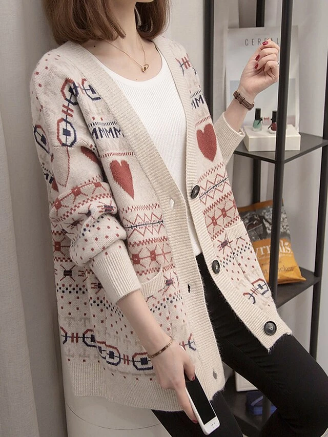 Women’s Ugly Christmas Sweater Cardigan Christmas Sweaters V Neck Ribbed Knit Polyester Button Knitted Print Fall Winter Regular Outdoor Christmas Daily Stylish Casual Soft Long Sleeve Heart Letter