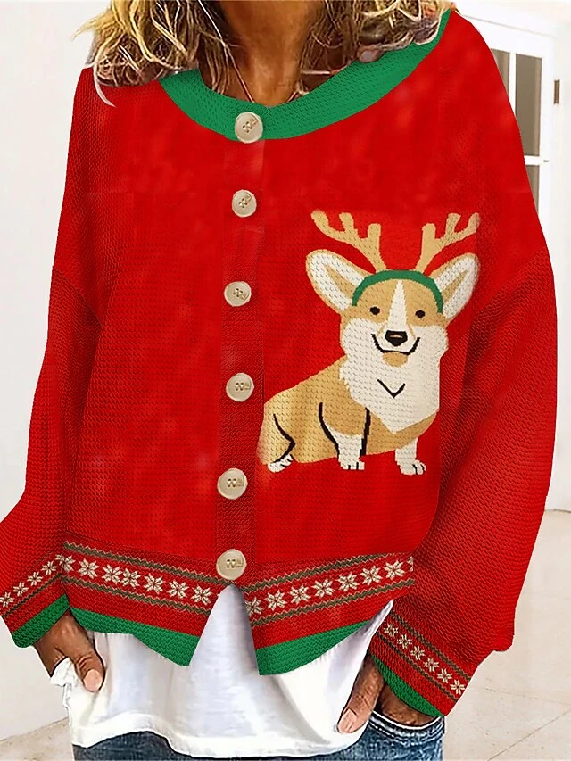 Women’s Ugly Christmas Sweater Cardigan Sweater Crew Neck Ribbed Knit Polyester Button Print Fall Winter Regular Outdoor Xmas Holiday Stylish Casual Soft Long Sleeve Geometric Striped Print