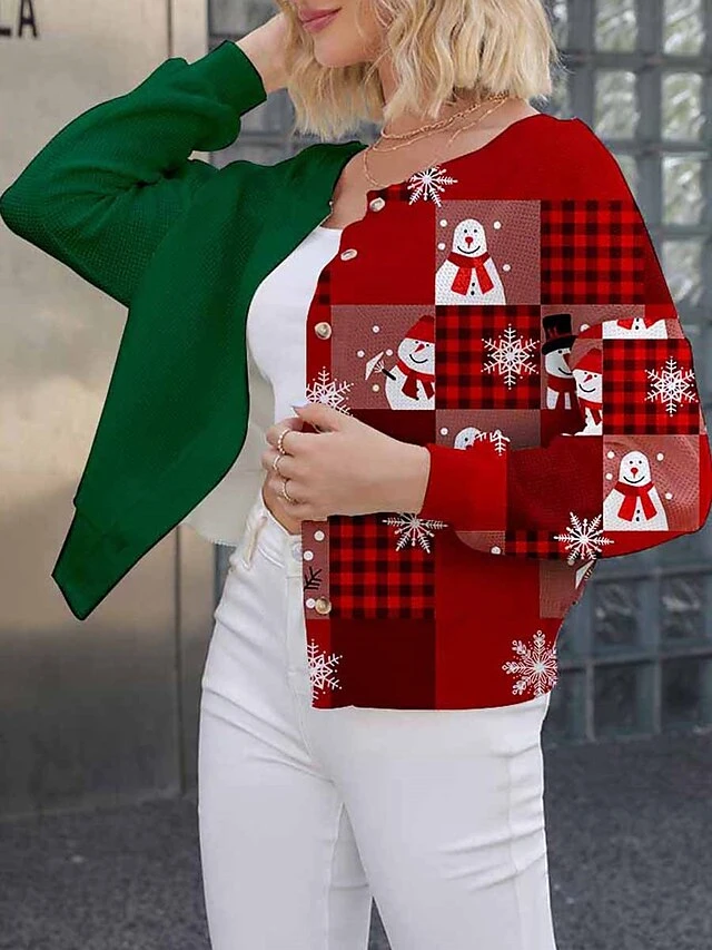 Women’s Ugly Christmas Sweater Cardigan Sweater Jacket Crew Neck Ribbed Knit Polyester Button Knitted Print Fall Winter Short Outdoor Christmas Holiday Daily Stylish Casual Long Sleeve Plaid Snowman