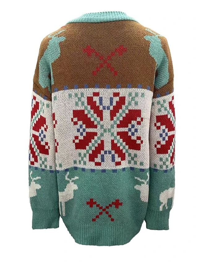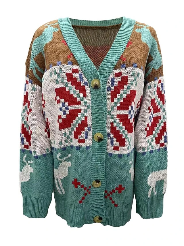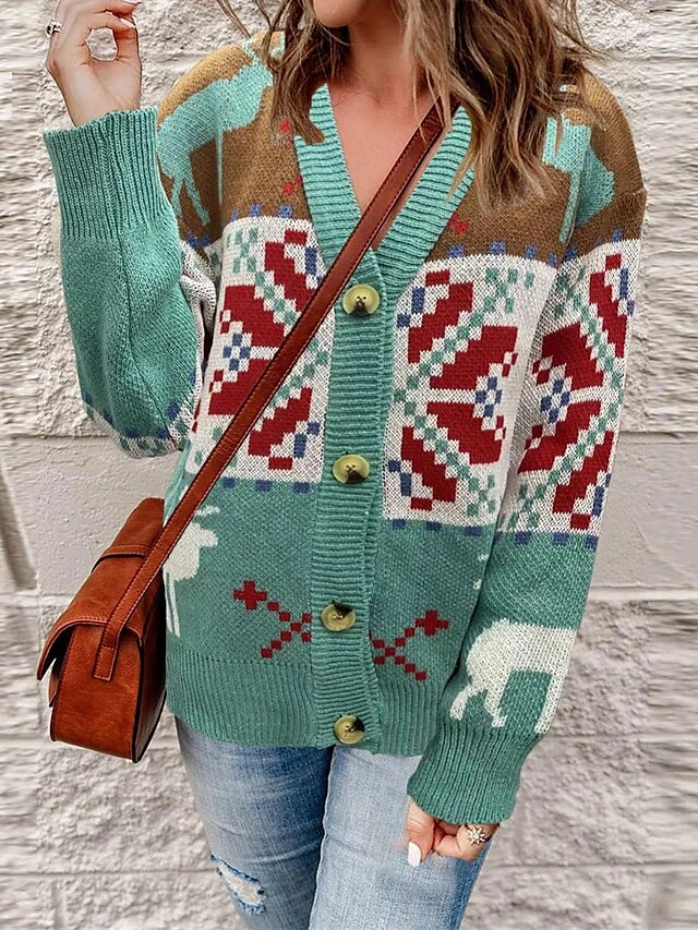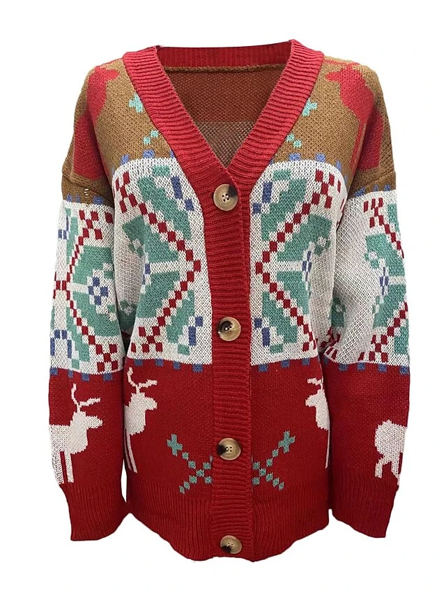 Women’s Ugly Christmas Sweater Cardigan Sweater Jacket V Neck Ribbed Knit Polyester Button Knitted Fall Winter Regular Outdoor Christmas Daily Stylish Casual Soft Long Sleeve Geometric Color Block Elk