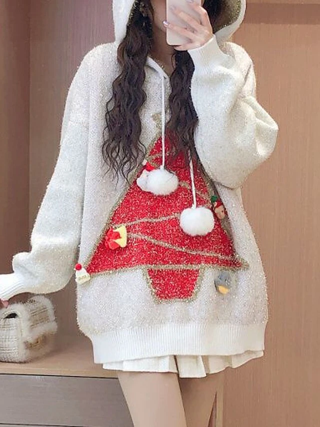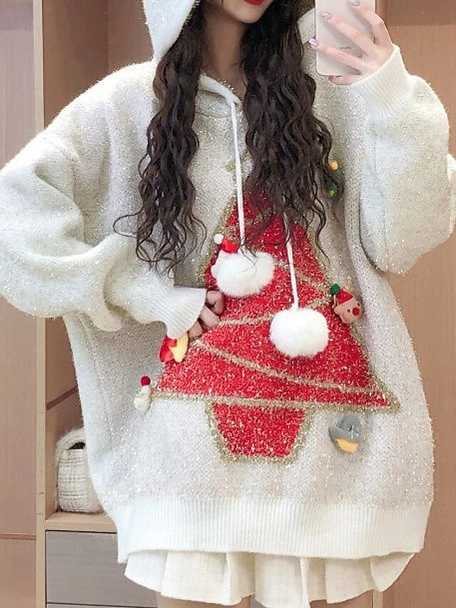Women’s Ugly Christmas Sweater Pullover Sweater Jumper Christmas Sweaters Hooded Ribbed Knit Polyester Knitted Print Fall Winter Regular Outdoor Christmas Daily Stylish Casual Soft Long Sleeve
