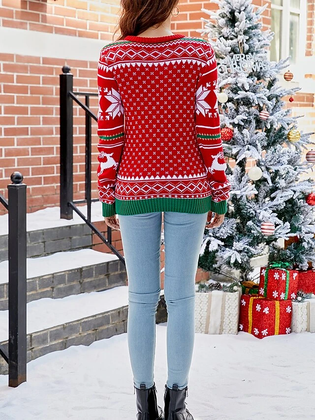 Women’s Ugly Christmas Sweater Pullover Sweater Jumper Crew Neck Chunky Knit Acrylic Patchwork Drop Shoulder Spring Fall Winter Regular Party Xmas Daily Stylish Casual Long Sleeve Letter Red S M