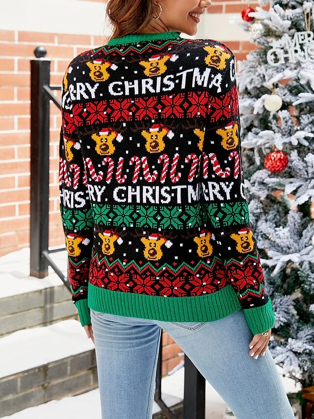 Women’s Ugly Christmas Sweater Pullover Sweater Jumper Crew Neck Chunky Knit Acrylic Patchwork Drop Shoulder Spring Fall Winter Regular Party Xmas Stylish Long Sleeve Animal Black S M L