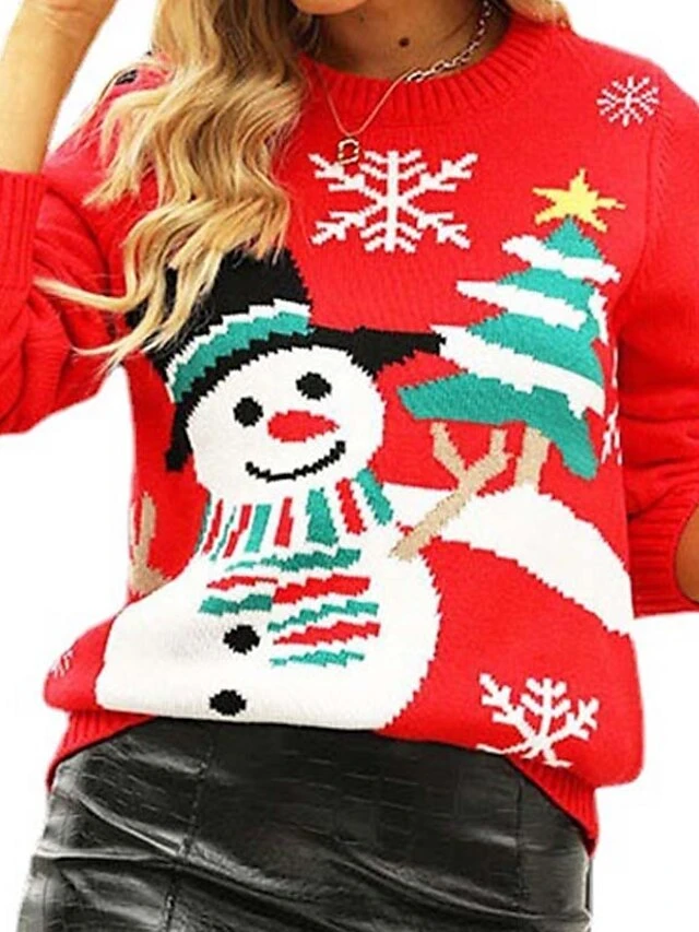 Women’s Ugly Christmas Sweater Pullover Sweater Jumper Crew Neck Ribbed Knit Acrylic Knitted Fall Winter Outdoor Xmas Holiday Stylish Casual Soft Long Sleeve Snowman Christmas Tree Snowflake Red