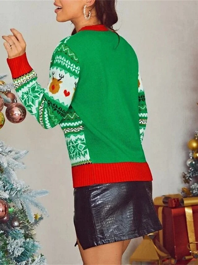 Women’s Ugly Christmas Sweater Pullover Sweater Jumper Crew Neck Ribbed Knit Acrylic Oversized Fall Winter Regular Outdoor Christmas Daily Stylish Casual Soft Long Sleeve Elk Christmas Tree Green S M
