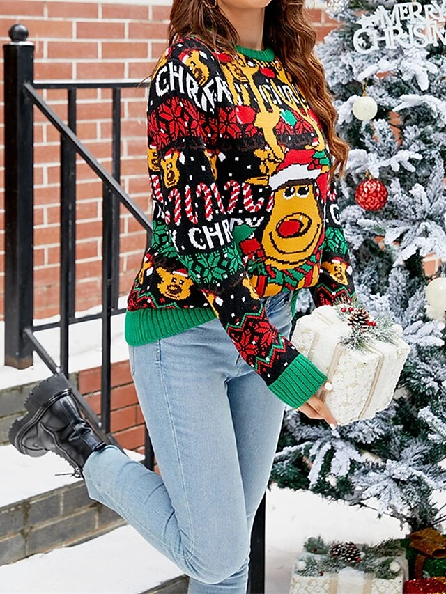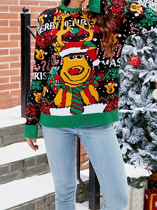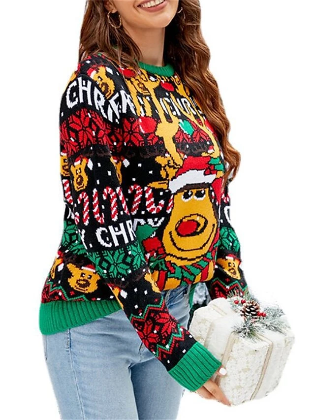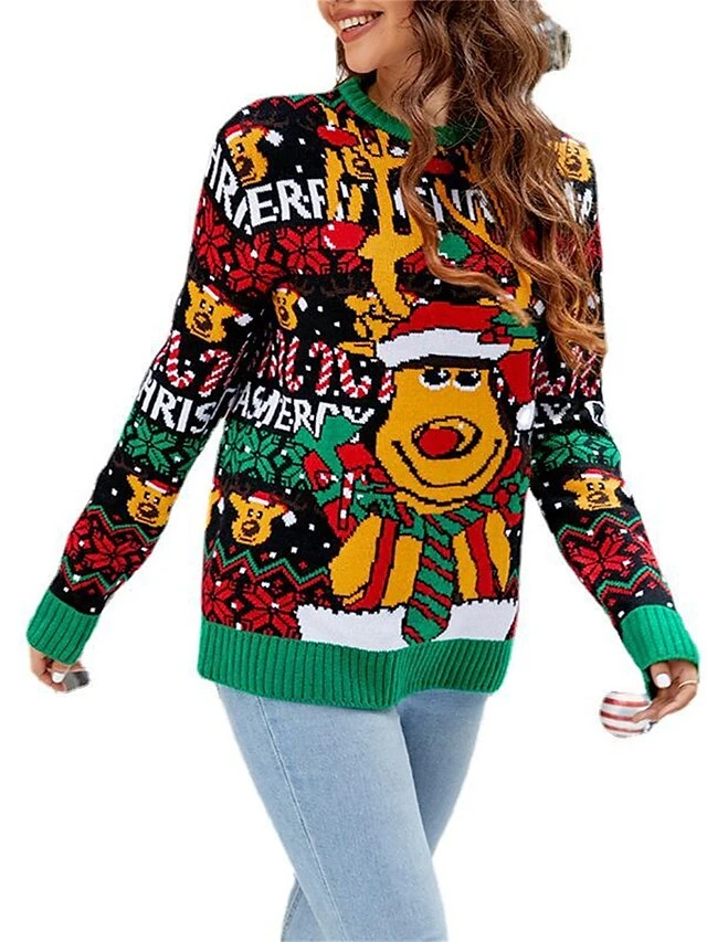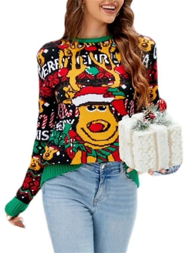 Women’s Ugly Christmas Sweater Pullover Sweater Jumper Crew Neck Ribbed Knit Acrylic Oversized Fall Winter Short Xmas Daily Going Out Stylish Casual Soft Long Sleeve Letter Elk 1072 Christmas