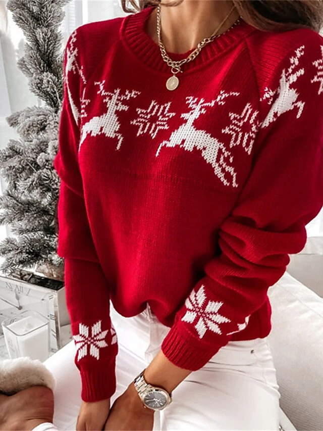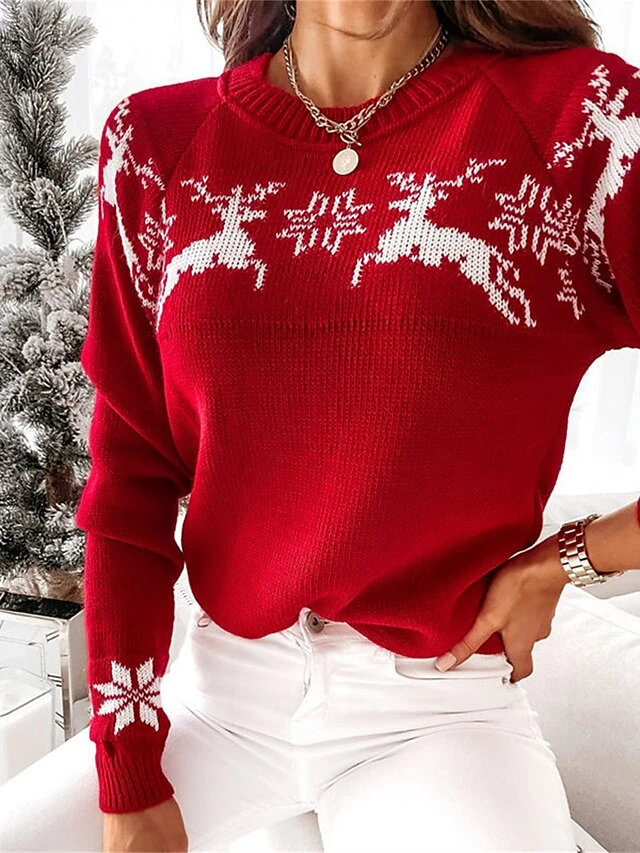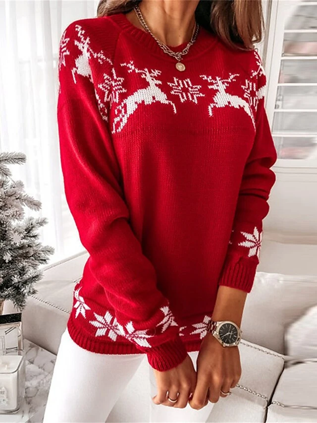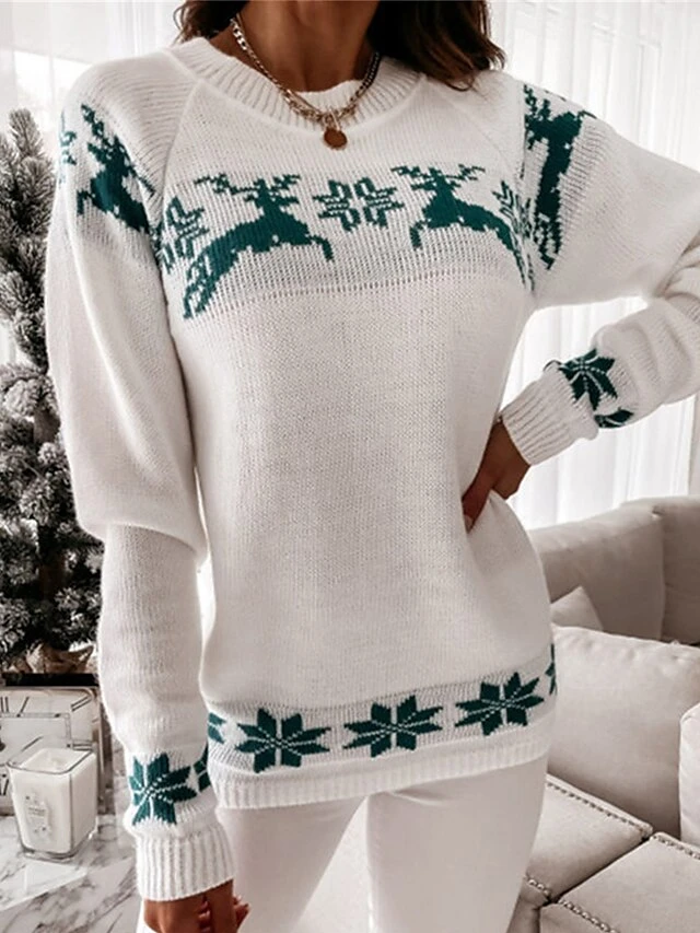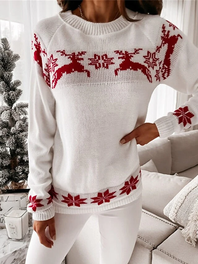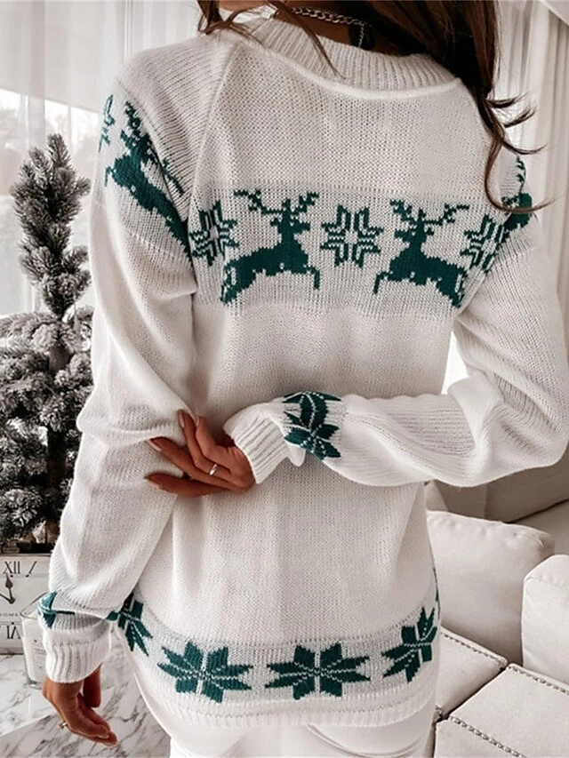 Women’s Ugly Christmas Sweater Pullover Sweater Jumper Crew Neck Ribbed Knit Acrylic Patchwork Fall Winter Regular Outdoor Xmas Daily Stylish Casual Soft Long Sleeve Elk Snowflake White Red Green