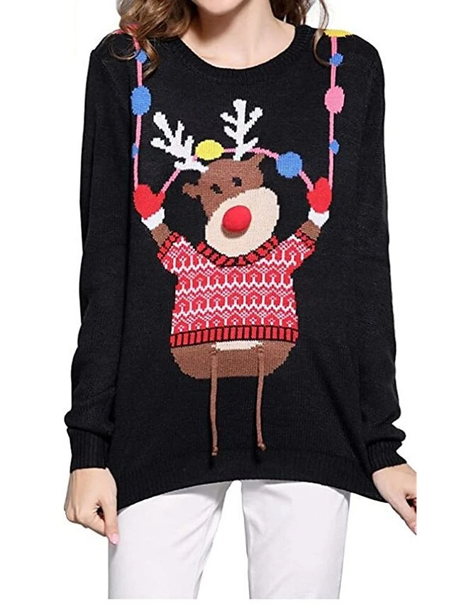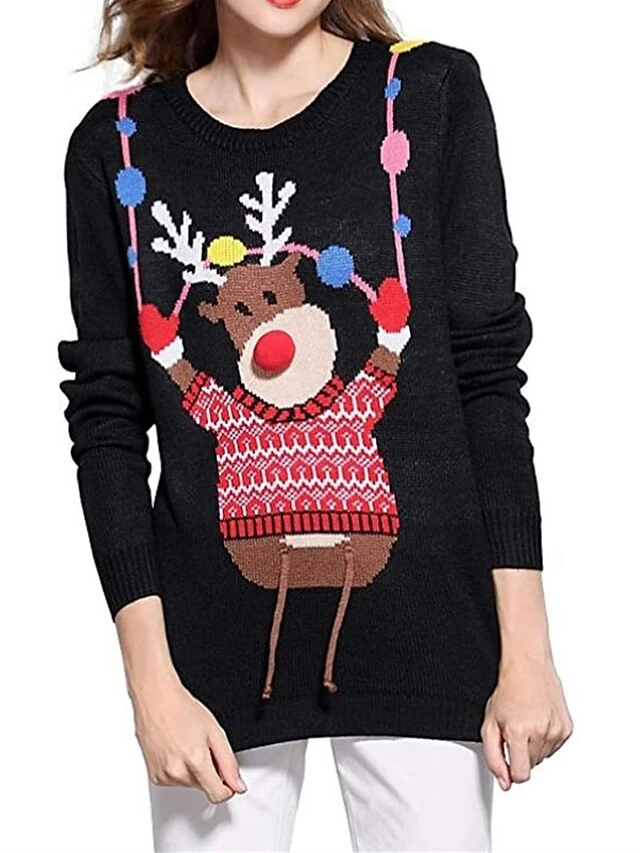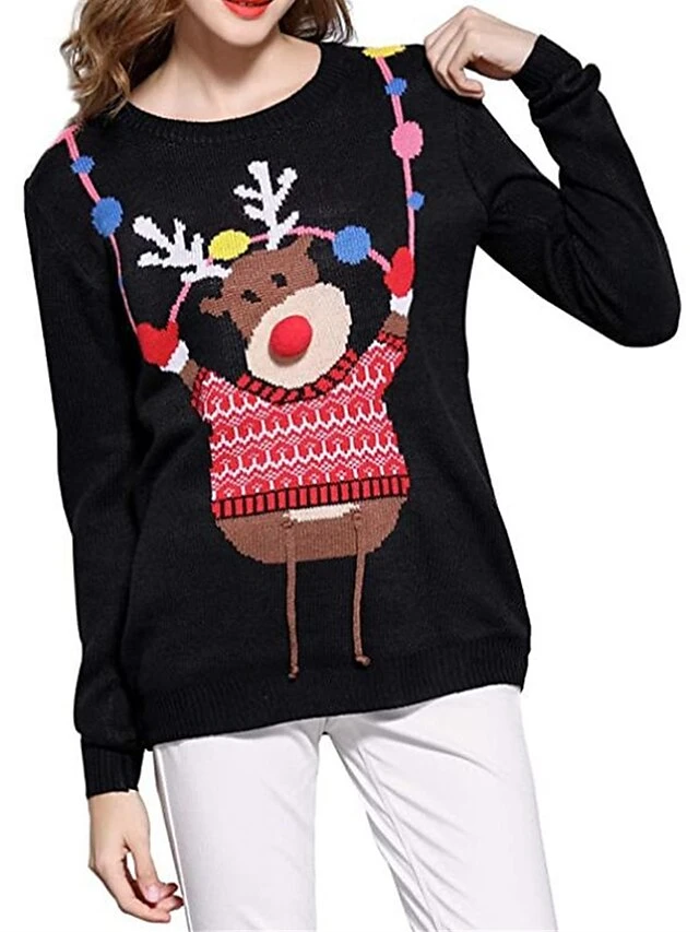 Women’s Ugly Christmas Sweater Pullover Sweater Jumper Crew Neck Ribbed Knit Acrylic Patchwork Fall Winter Regular Outdoor Xmas Daily Stylish Casual Soft Long Sleeve Geometric Elk Black S M L