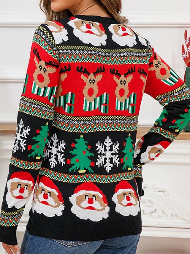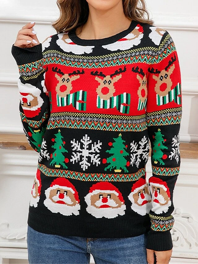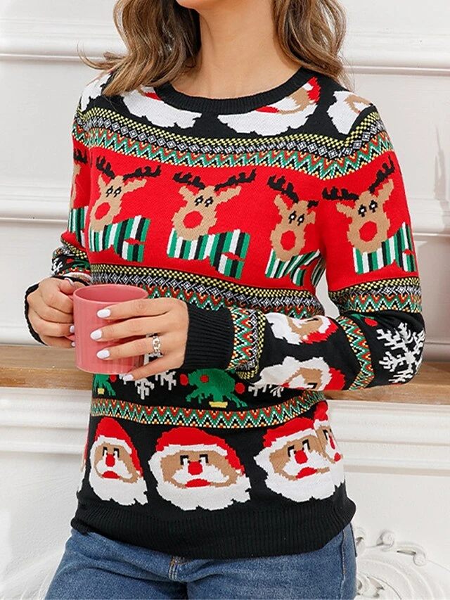 Women’s Ugly Christmas Sweater Pullover Sweater Jumper Crew Neck Ribbed Knit Acrylic Patchwork Fall Winter Regular Outdoor Xmas Daily Stylish Casual Soft Long Sleeve Santa Claus Elk Snowflake Red