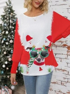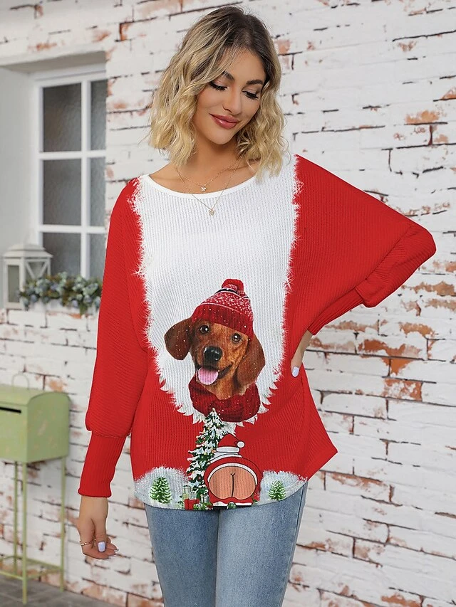Women’s Ugly Christmas Sweater Pullover Sweater Jumper Crew Neck Ribbed Knit Polyester Knitted Print Fall Winter Regular Outdoor Xmas Holiday Daily Stylish Casual Long Sleeve Animal White Wine S
