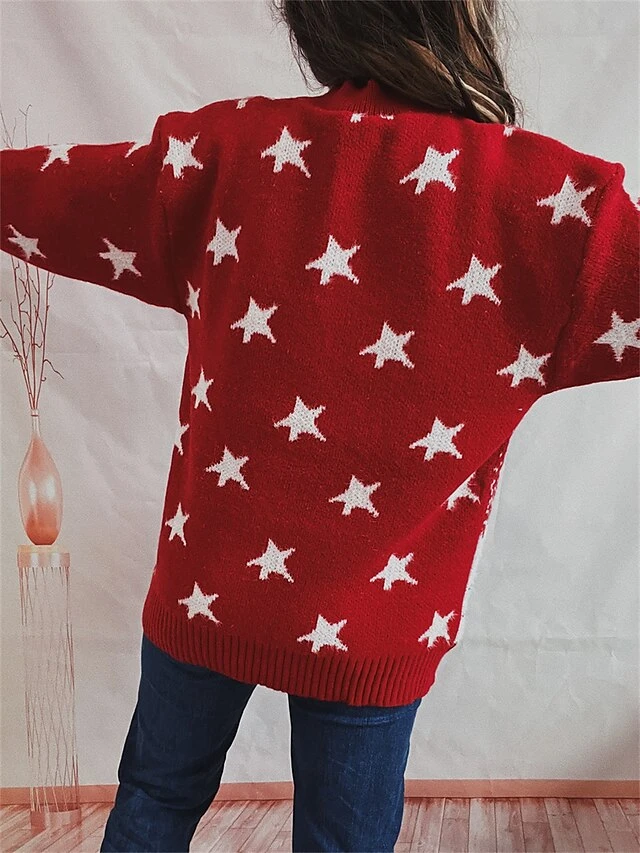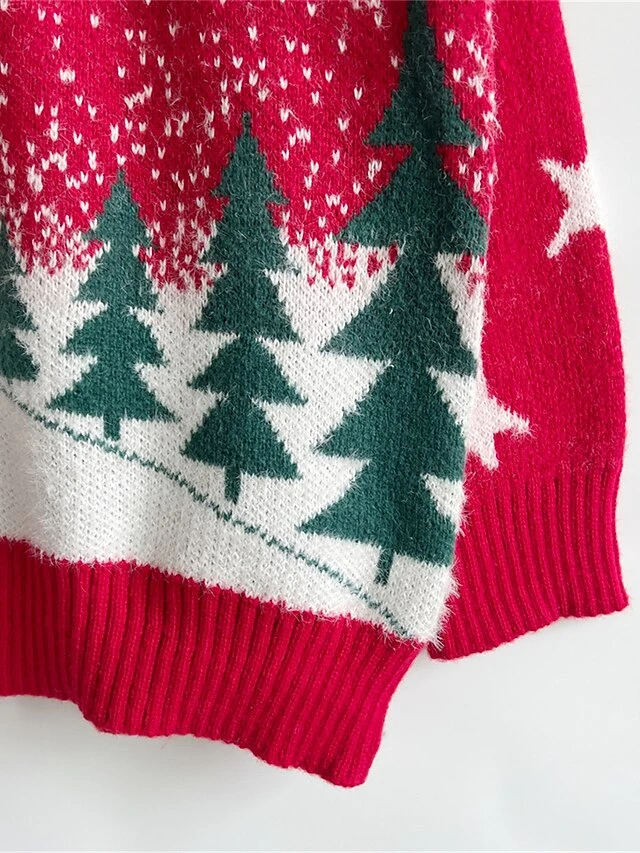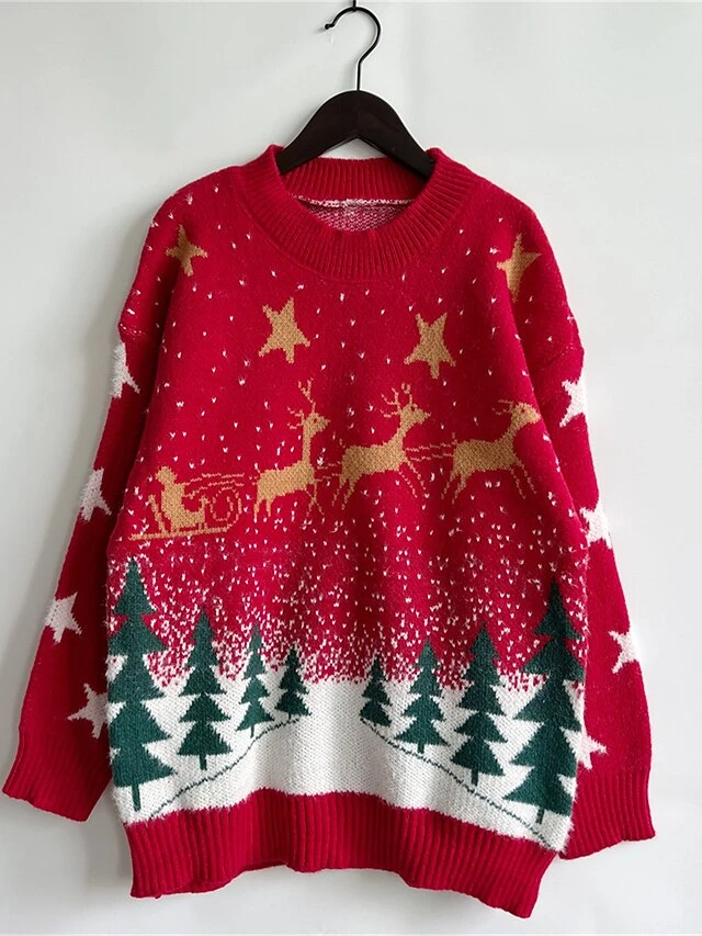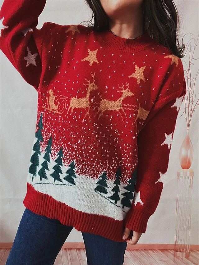 Women’s Ugly Christmas Sweater Pullover Sweater Jumper Crew Neck Ribbed Knit Polyester Oversized Fall Winter Regular Outdoor Xmas Daily Stylish Casual Soft Long Sleeve Star Elk Christmas Tree Red