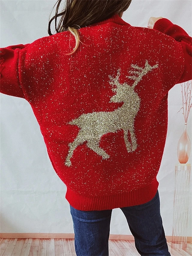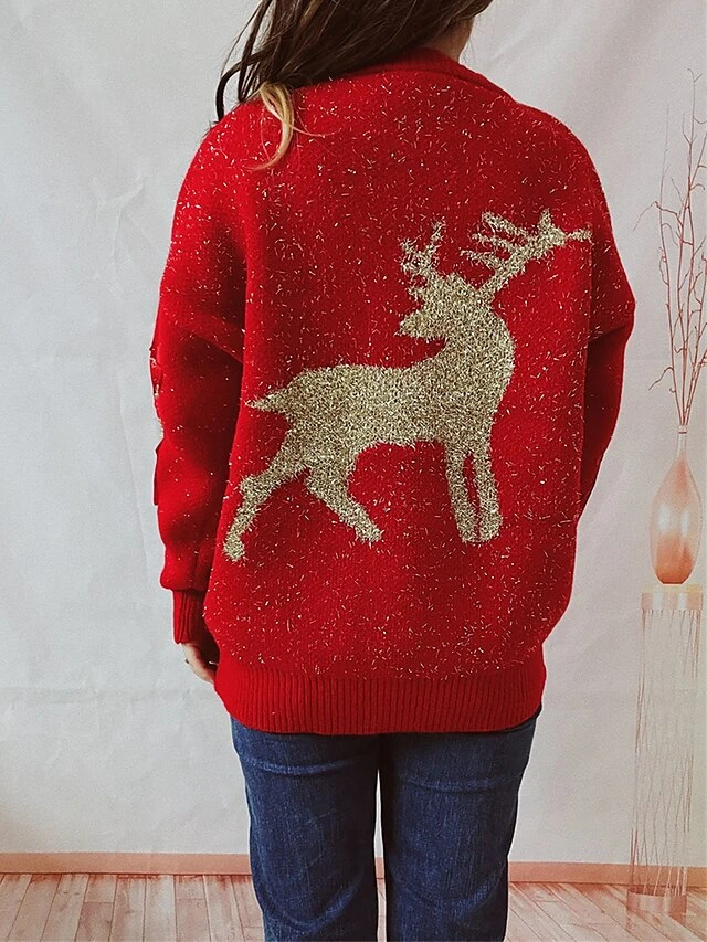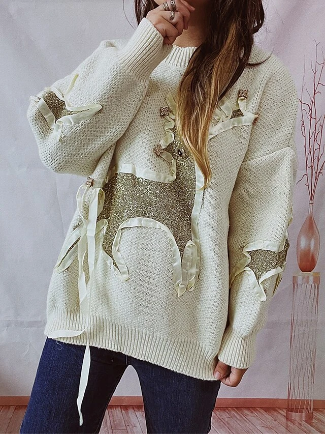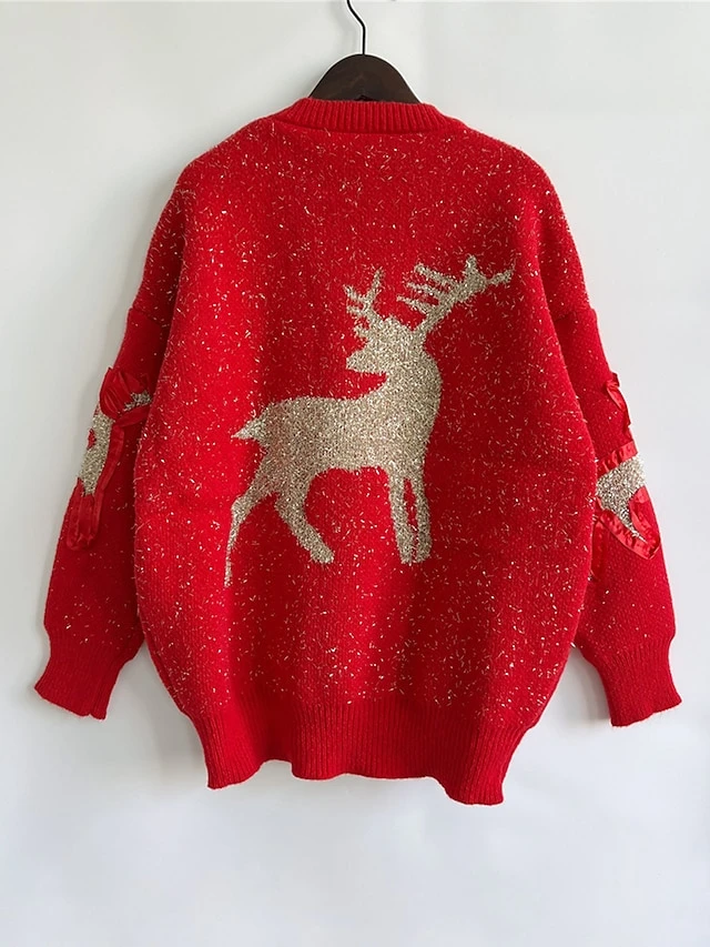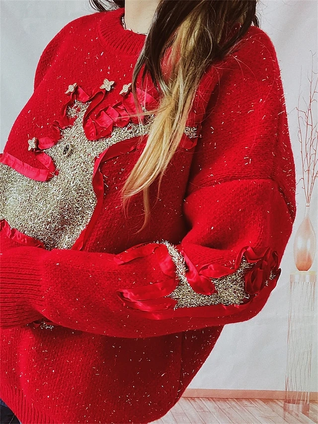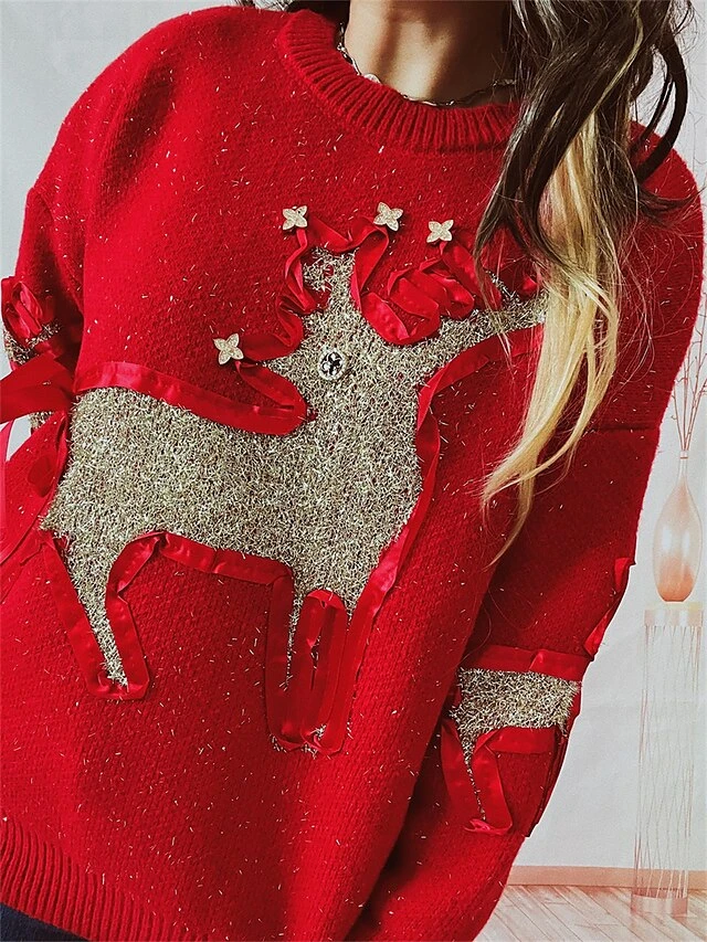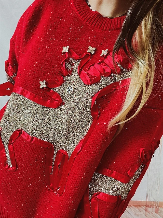 Women’s Ugly Christmas Sweater Pullover Sweater Jumper Crew Neck Ribbed Knit Polyester Patchwork Fall Winter Regular Outdoor Christmas Daily Stylish Casual Soft Long Sleeve Elk Red Beige S M L