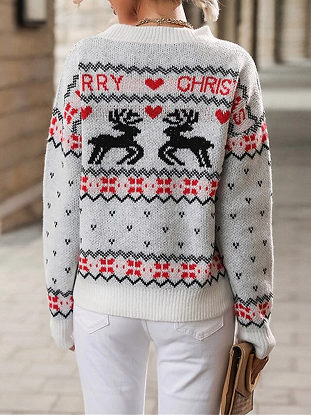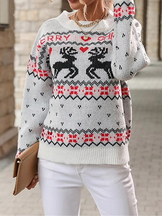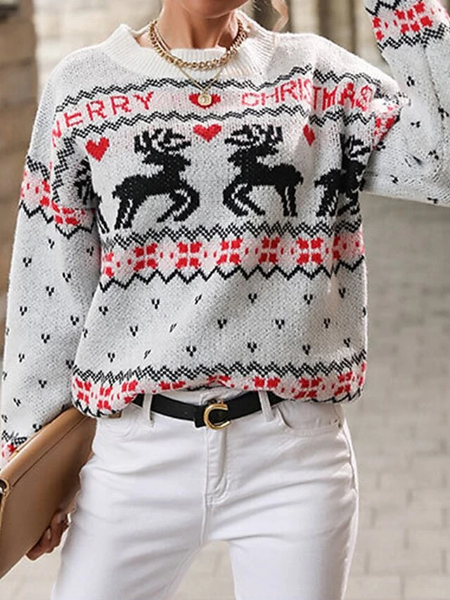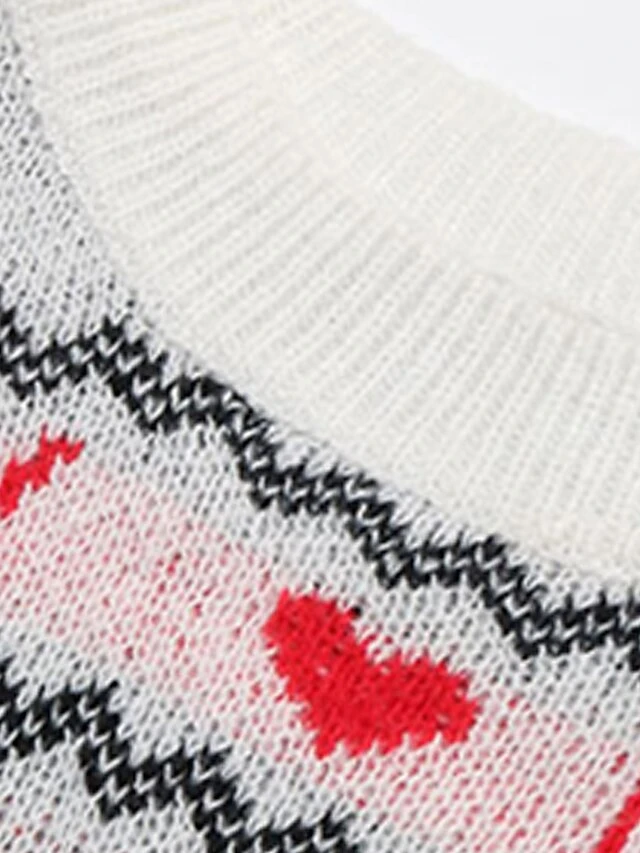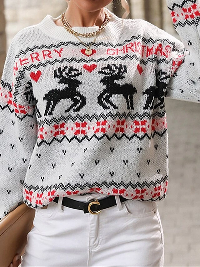 Women’s Ugly Christmas Sweater Pullover Sweater Jumper Crew Neck Ribbed Knit Polyester Patchwork Fall Winter Regular Outdoor Christmas Daily Stylish Casual Soft Long Sleeve Heart Elk White S M L