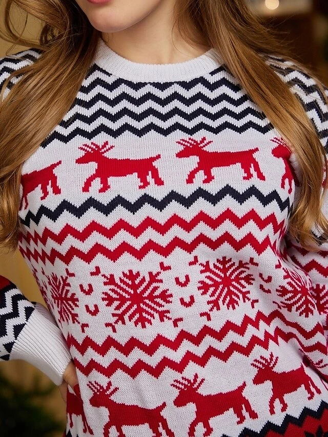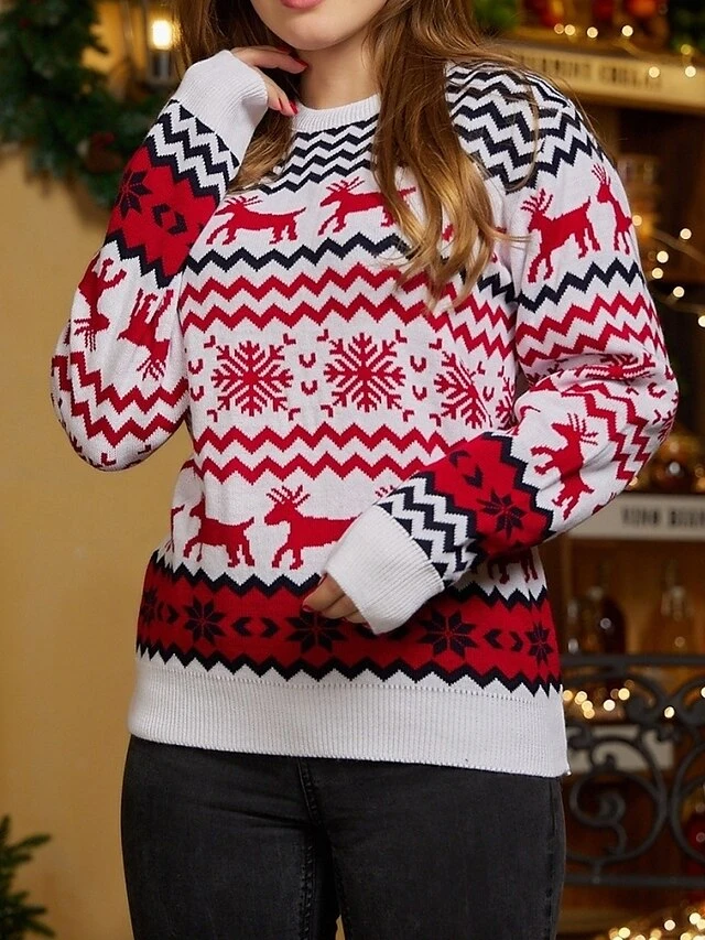 Women’s Ugly Christmas Sweater Pullover Sweater Jumper Crew Neck Ribbed Knit Polyester Patchwork Fall Winter Regular Outdoor Xmas Daily Stylish Casual Soft Long Sleeve Elk Striped Snowflake