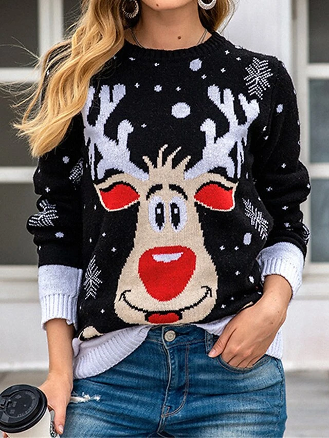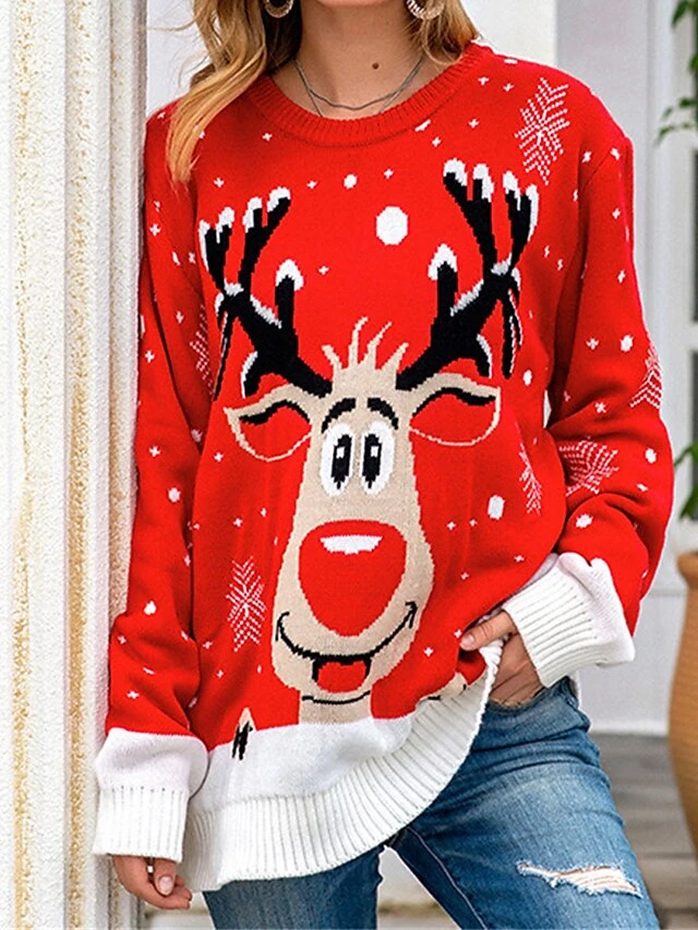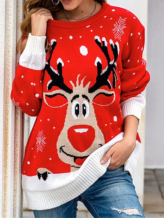 Women’s Ugly Christmas Sweater Pullover Sweater Jumper Crew Neck Ribbed Knit Polyester Patchwork Fall Winter Regular Xmas Daily Going Out Stylish Casual Soft Long Sleeve Elk Snowflake Black Red