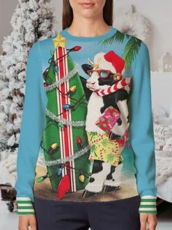 Women’s Ugly Christmas Sweater Pullover Sweater Jumper Crew Neck Ribbed Knit Polyester Print Fall Winter Regular Outdoor Xmas Holiday Stylish Casual Soft Long Sleeve Animal Blue Beige S M L