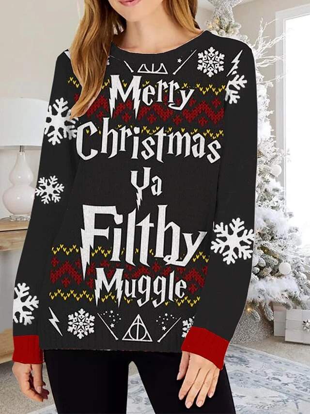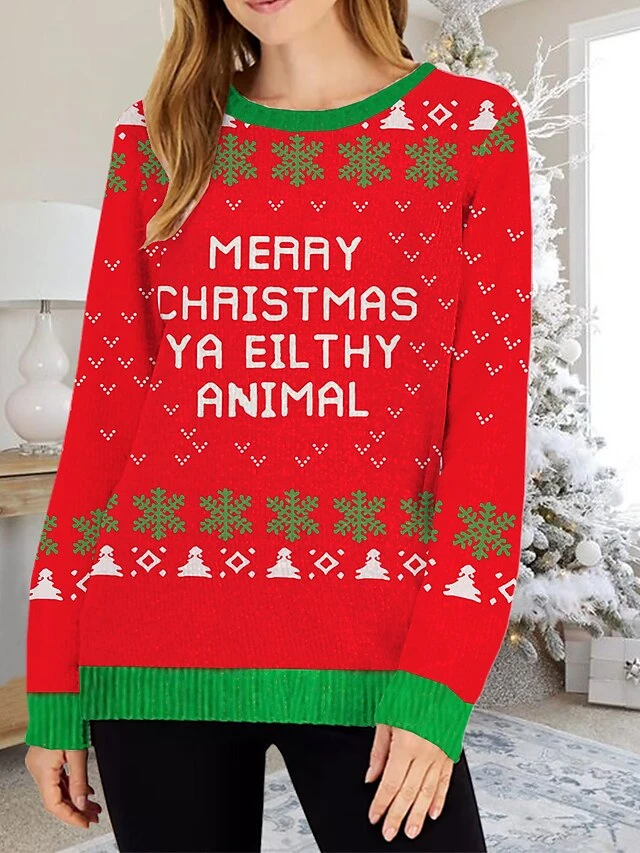 Women’s Ugly Christmas Sweater Pullover Sweater Jumper Crew Neck Ribbed Knit Polyester Print Fall Winter Regular Outdoor Xmas Holiday Stylish Casual Soft Long Sleeve Letter Black Red S M L