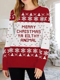 Women’s Ugly Christmas Sweater Pullover Sweater Jumper Crew Neck Ribbed Knit Polyester Print Fall Winter Regular Outdoor Xmas Holiday Stylish Casual Soft Long Sleeve Letter Red Purple S M L