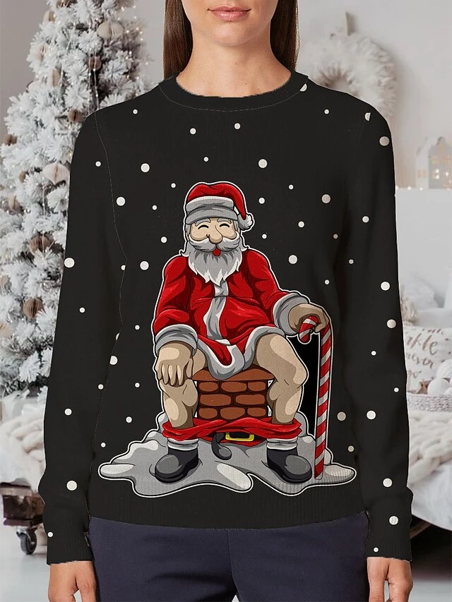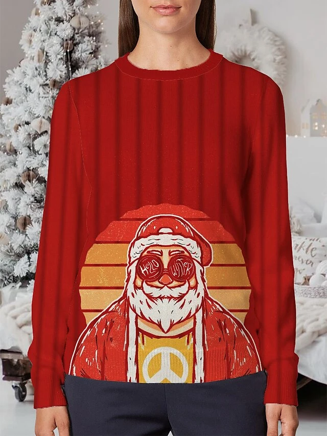 Women’s Ugly Christmas Sweater Pullover Sweater Jumper Crew Neck Ribbed Knit Polyester Print Fall Winter Regular Outdoor Xmas Holiday Stylish Casual Soft Long Sleeve Santa Claus Black Red S M L