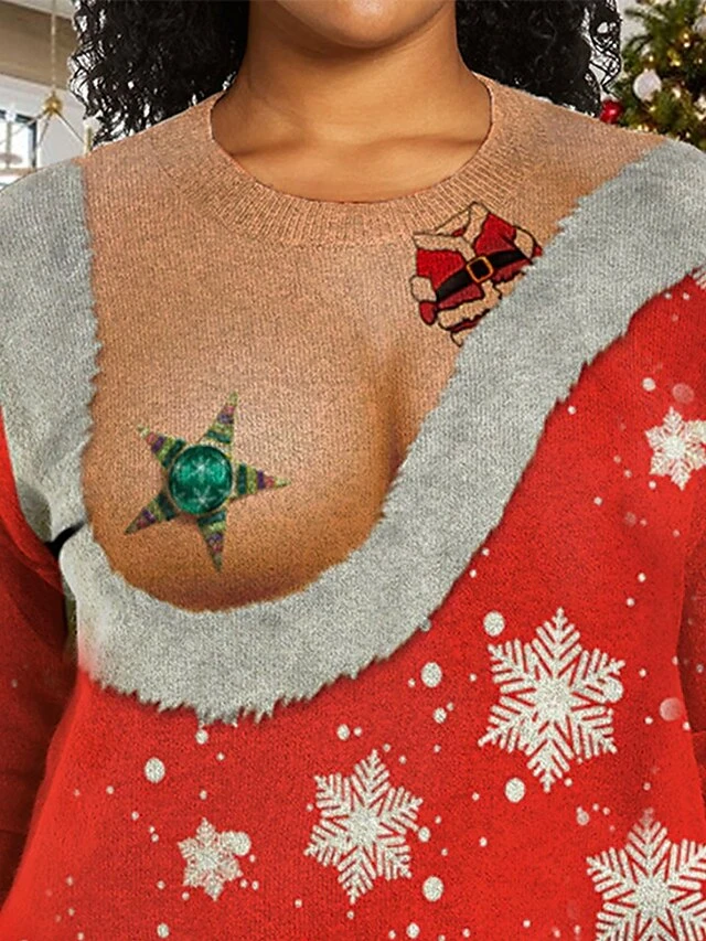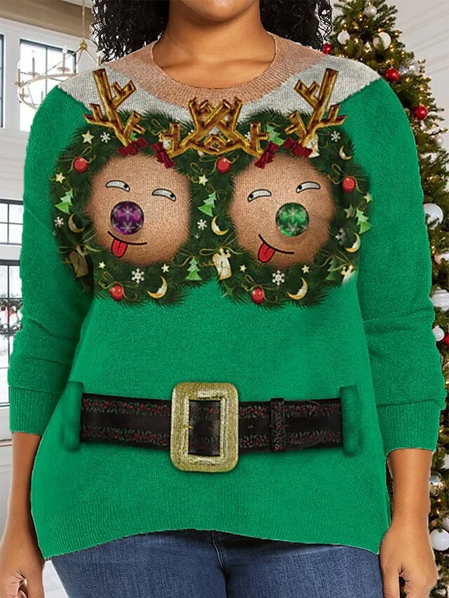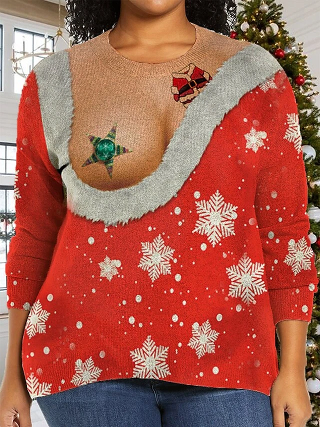 Women’s Ugly Christmas Sweater Pullover Sweater Jumper Crew Neck Ribbed Knit Polyester Print Fall Winter Regular Xmas Daily Going Out Stylish Plus Size Casual Long Sleeve Print Red Green XL 2XL