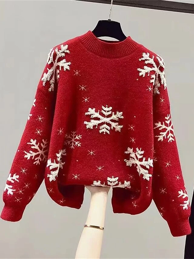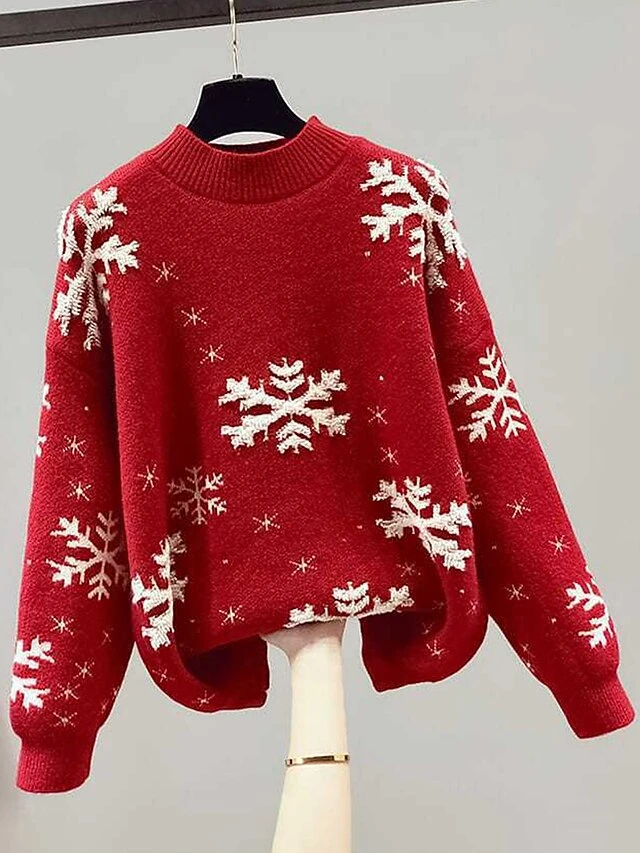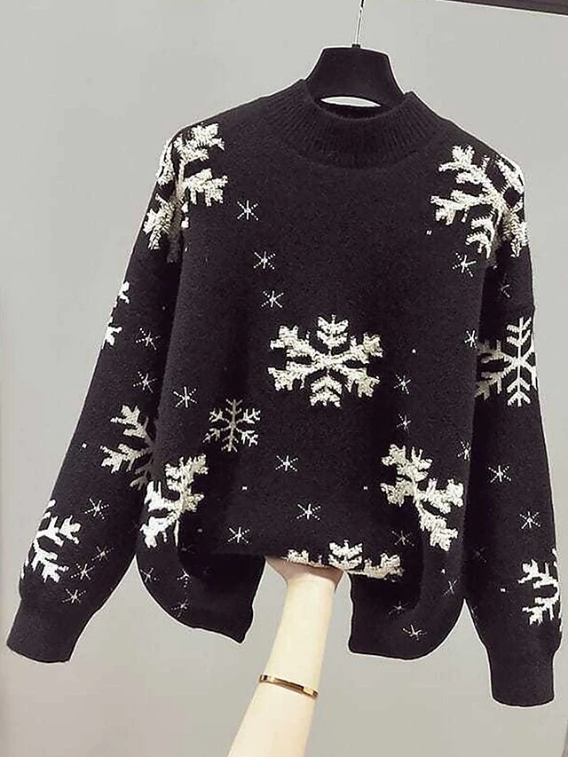 Women’s Ugly Christmas Sweater Pullover Sweater Jumper Stand Collar Ribbed Knit Nylon Patchwork Fall Winter Regular Outdoor Christmas Daily Stylish Casual Soft Long Sleeve Snowflake Black Red One-Size