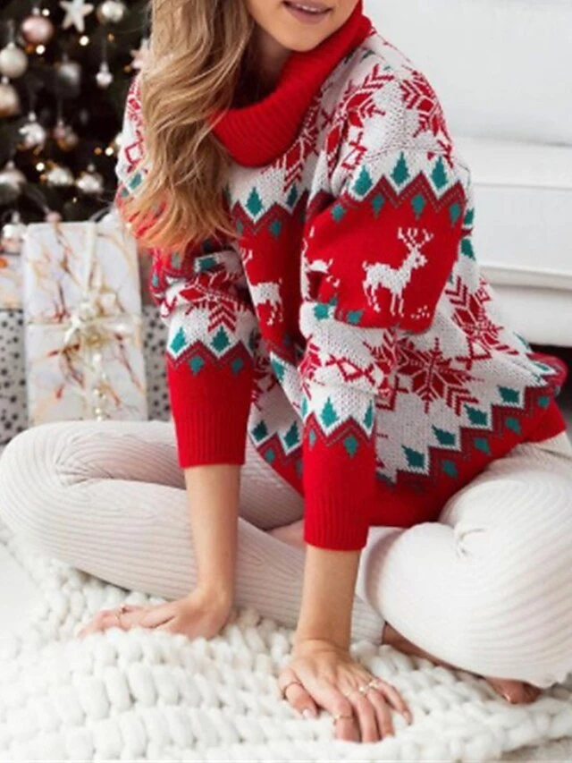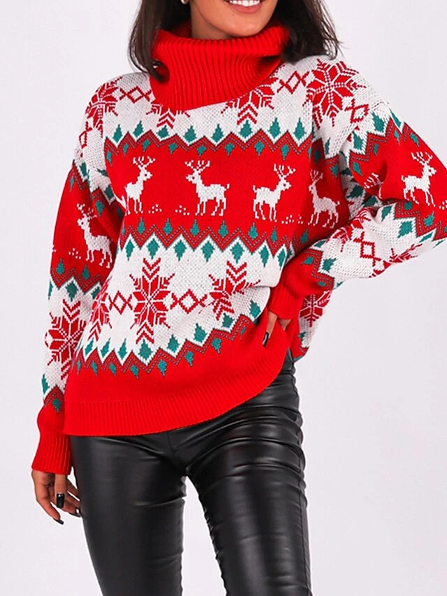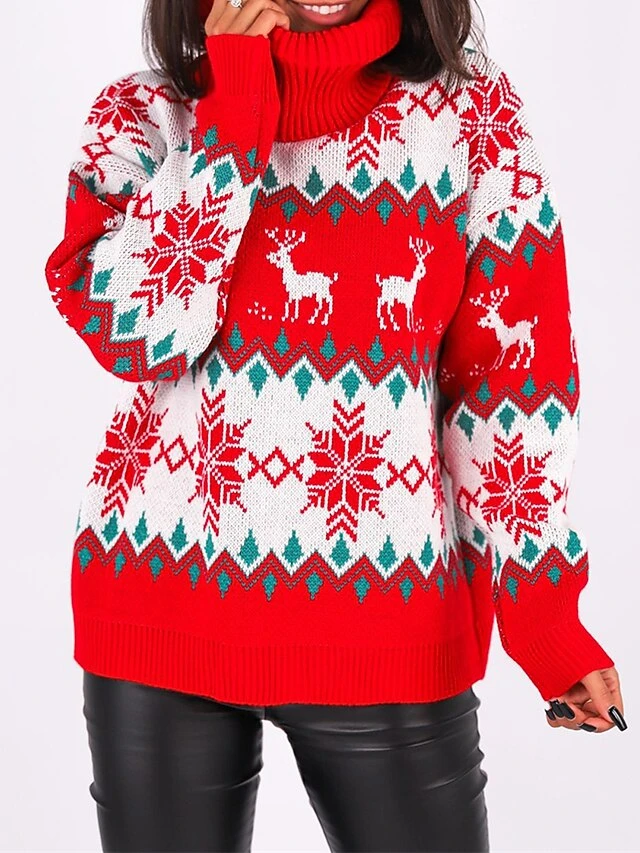 Women’s Ugly Christmas Sweater Pullover Sweater Jumper Turtleneck Ribbed Knit Acrylic Oversized Fall Winter Regular Outdoor Christmas Daily Stylish Casual Soft Long Sleeve Elk Snowflake Black Red S M