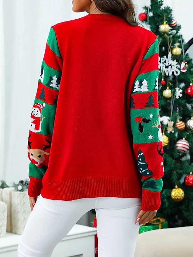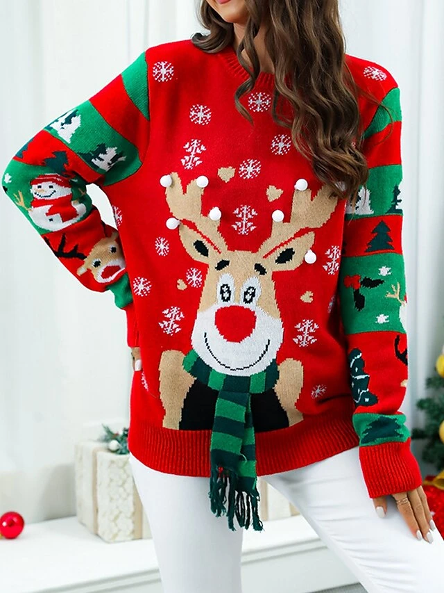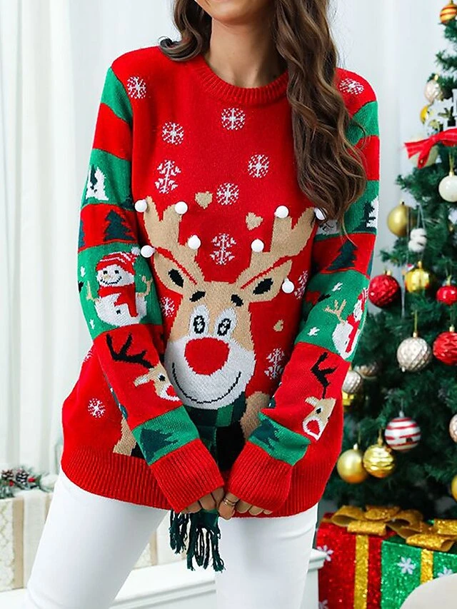 Women’s Ugly Christmas Sweater Pullover Sweater Jumper V Neck Ribbed Knit Polyester Knitted Print Fall Winter Regular Outdoor Xmas Holiday Daily Stylish Casual Long Sleeve Print Snowflake Wine